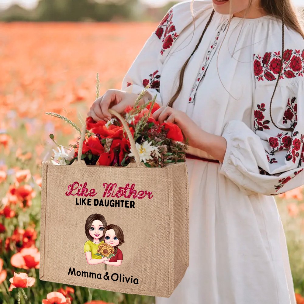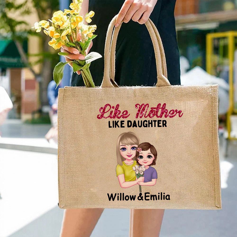This bag features the heartwarming phrase "Like Mother, Like Daughter" and is printed with cartoon images of a mother and daughter, along with their names. It's available in various styles, including open, magnetic closure, and zippered tote bags. A unique and meaningful accessory, it showcases the deep love and bond between mothers and daughters.