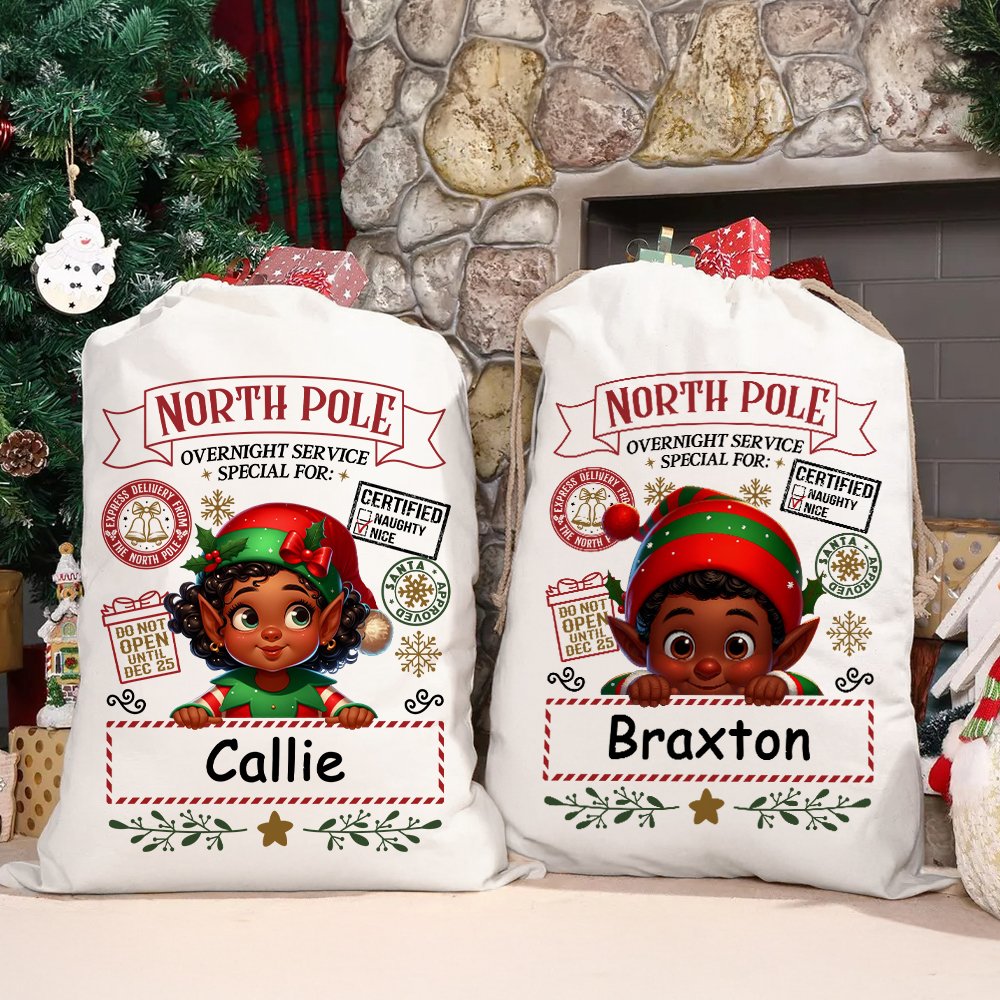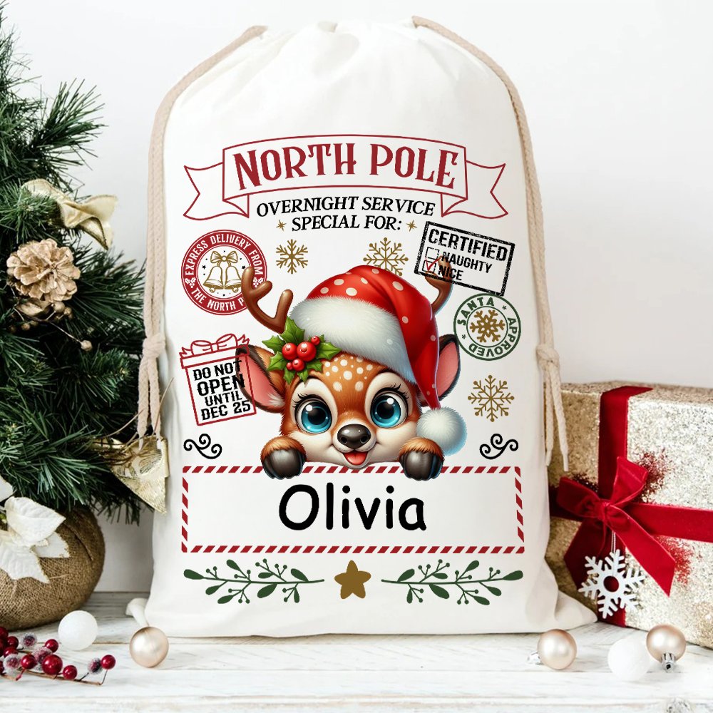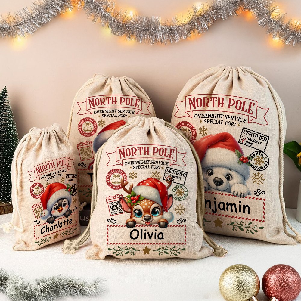 Each bag features a charming character, including a little elf, a reindeer, a polar bear, and Santa himself. The characters are depicted playfully and colorfully, adding a whimsical touch to the bags. The bags prominently display the "North Pole Overnight Service" logo, a fun and creative touch that gives the impression that the gifts inside were directly delivered from Santa's workshop. The logo is surrounded by festive elements like snowflakes and postage stamps, enhancing the Christmas spirit.