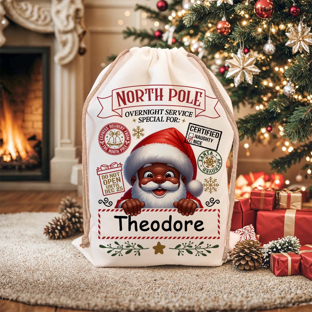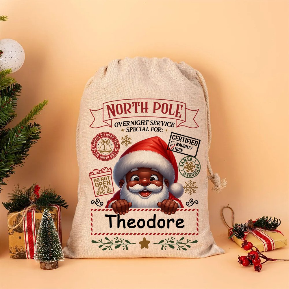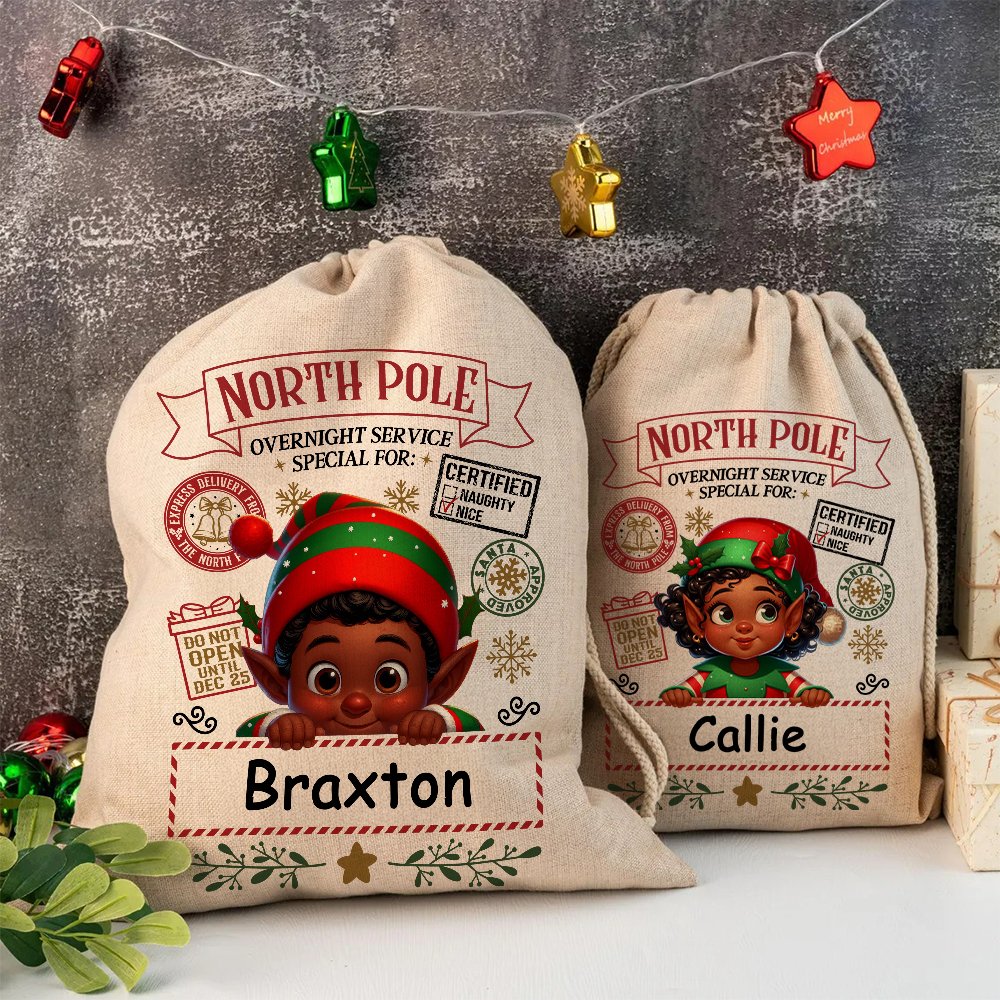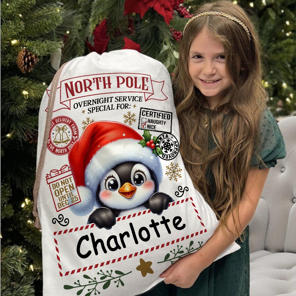 Each bag features a charming character, including a little elf, a reindeer, a polar bear, and Santa himself. The characters are depicted playfully and colorfully, adding a whimsical touch to the bags. The bags prominently display the "North Pole Overnight Service" logo, a fun and creative touch that gives the impression that the gifts inside were directly delivered from Santa's workshop. The logo is surrounded by festive elements like snowflakes and postage stamps, enhancing the Christmas spirit.