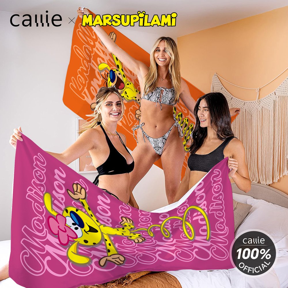 This beach towel features a warm design with a cute cartoon long-tailed leopard pattern, which created by Belgian cartoonist André Franquin in 1952, Marsupilami is a jungle-dwelling creature with yellow fur, black spots, and a super flexible long tail. You can choose the image of the cartoon long-tailed leopard "Matthew" and customize it with a name according to your preference. Our unique design, combined with nine thoughtful color options for the beach towel, allows you to create a towel that is exclusively yours.