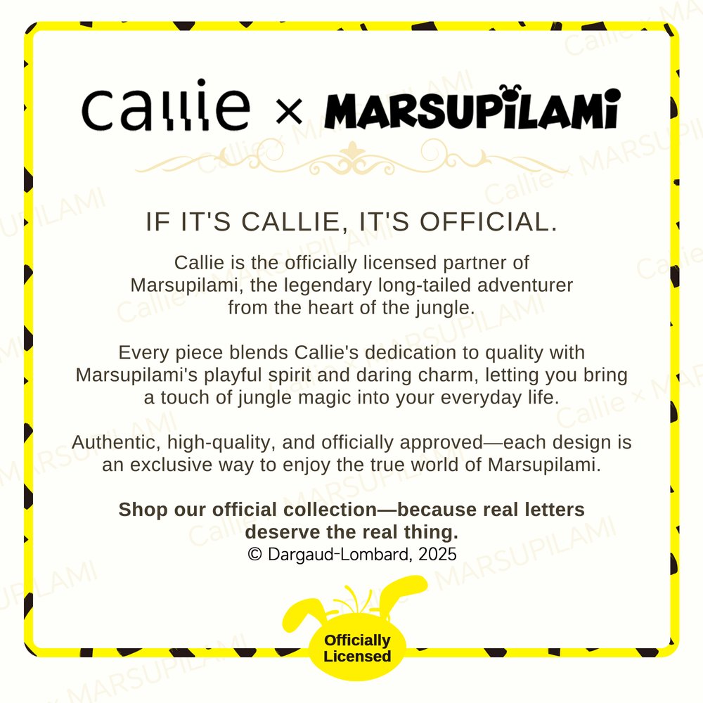 Callie is honored to offer officially licensed Marsupilami® products in collaboration with this iconic Belgian cartoon IP’s rights holder. We craft high-quality products that authentically capture Marsupilami’s timeless charm. It guarantees 100% authenticity—letting you bring home this classic cartoon treasure of joy and nostalgia with complete confidence.