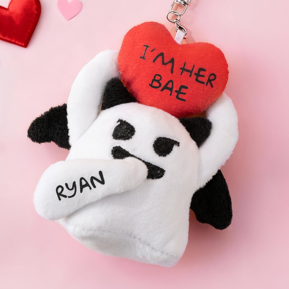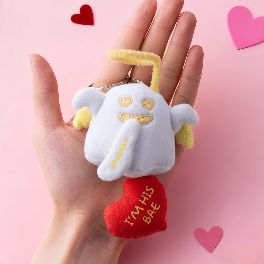 Personalised Love Heart Glow-In-The-Dark Cute Boo Plush Angel Devil Keychain with Name and Text Valentine's Day Gift for Couples