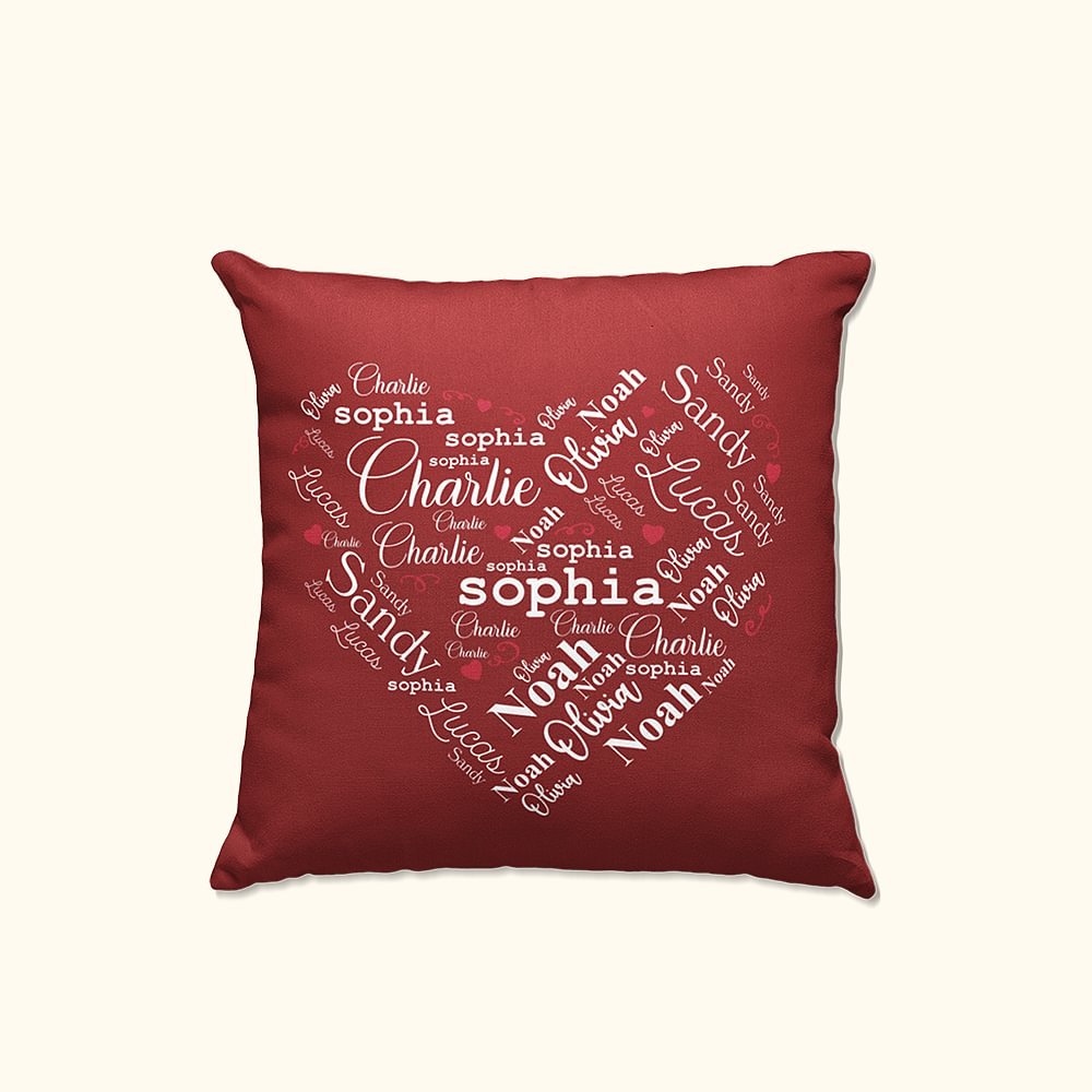 This throw pillow has a unique design. It is designed with multiple names surrounded by a heart shape, showing layers of love. You can write the names of family members on it to show that your family is united, your feelings are firm, and you help each other.