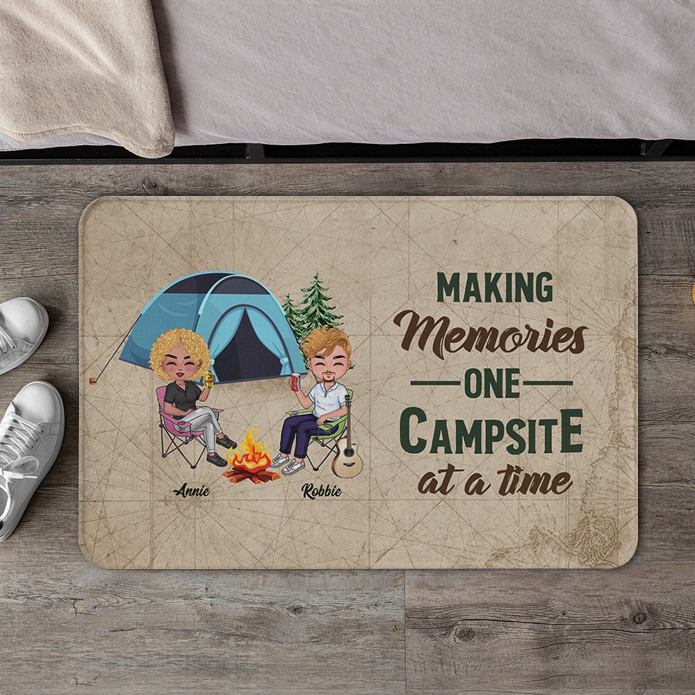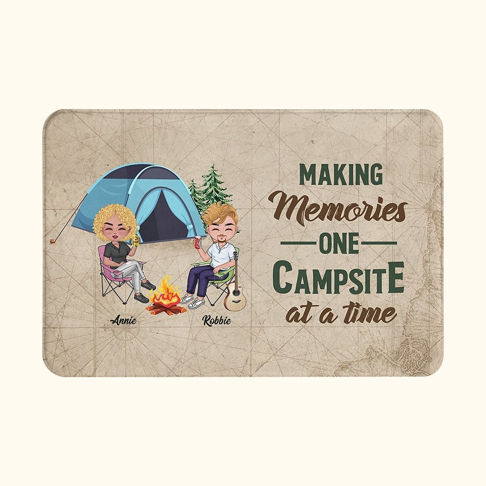 The message "Making Memories One Campsite at a Time" is beautifully printed on the doormat, reminding the couple of their everlasting love and the adventures they have shared.
