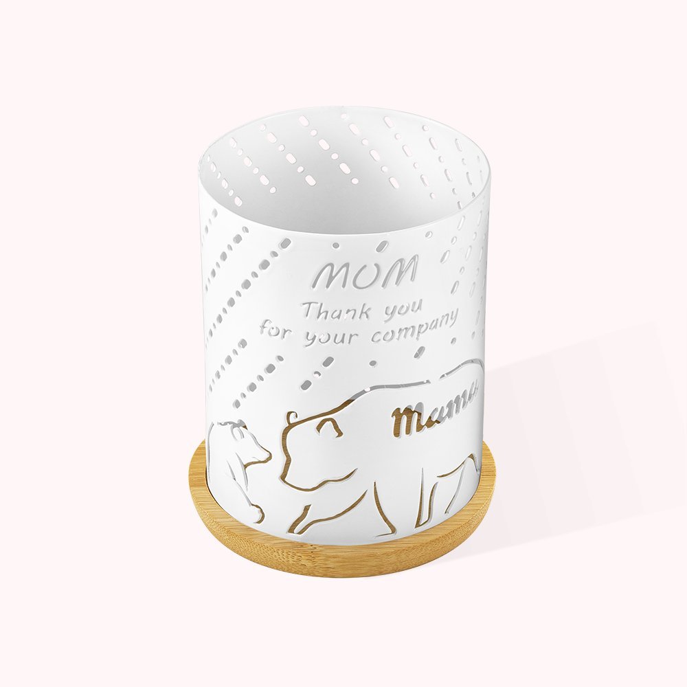 The design is inspired by the child's gratitude for the mother's constant love and companionship. The mama bear is used in the elements, reflecting the strength and greatness of the mother when raising her child. The hollowing process allows light to pass through the candle cover to form a light rain, creating a scene where the big bears and the little bears are cuddling with each other in the rain. On the back of the candle holder can be customized with the text you want to express your thanks and love to your mother.