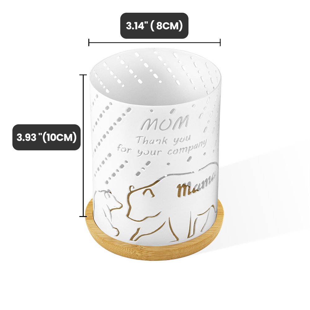The design is inspired by the child's gratitude for the mother's constant love and companionship. The mama bear is used in the elements, reflecting the strength and greatness of the mother when raising her child. The hollowing process allows light to pass through the candle cover to form a light rain, creating a scene where the big bears and the little bears are cuddling with each other in the rain. On the back of the candle holder can be customized with the text you want to express your thanks and love to your mother.