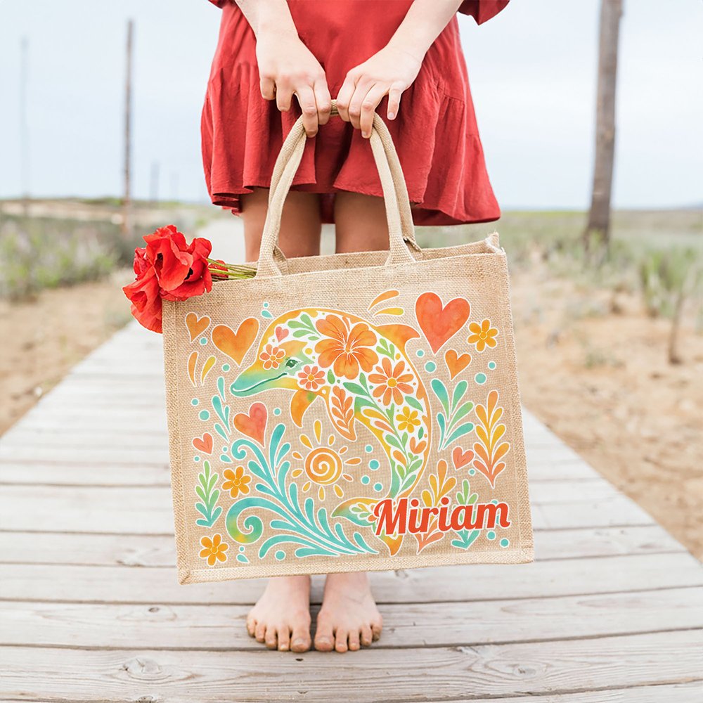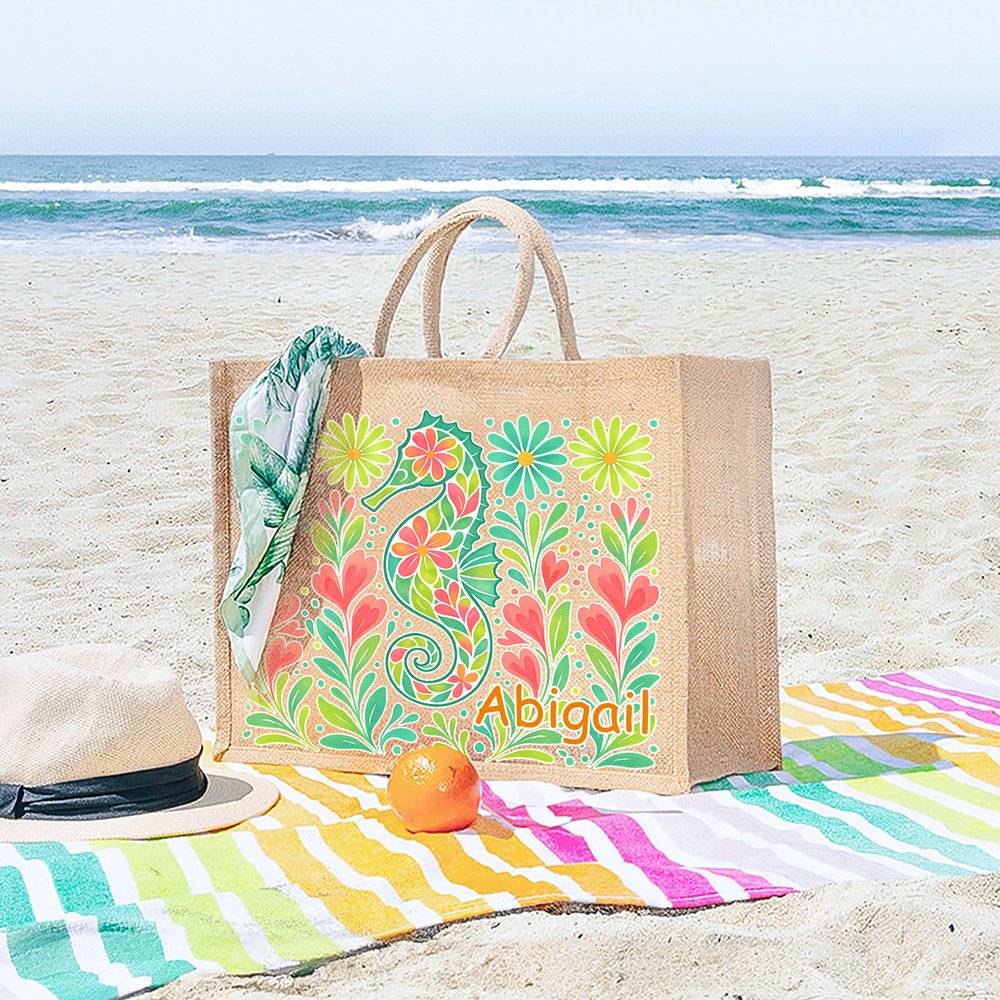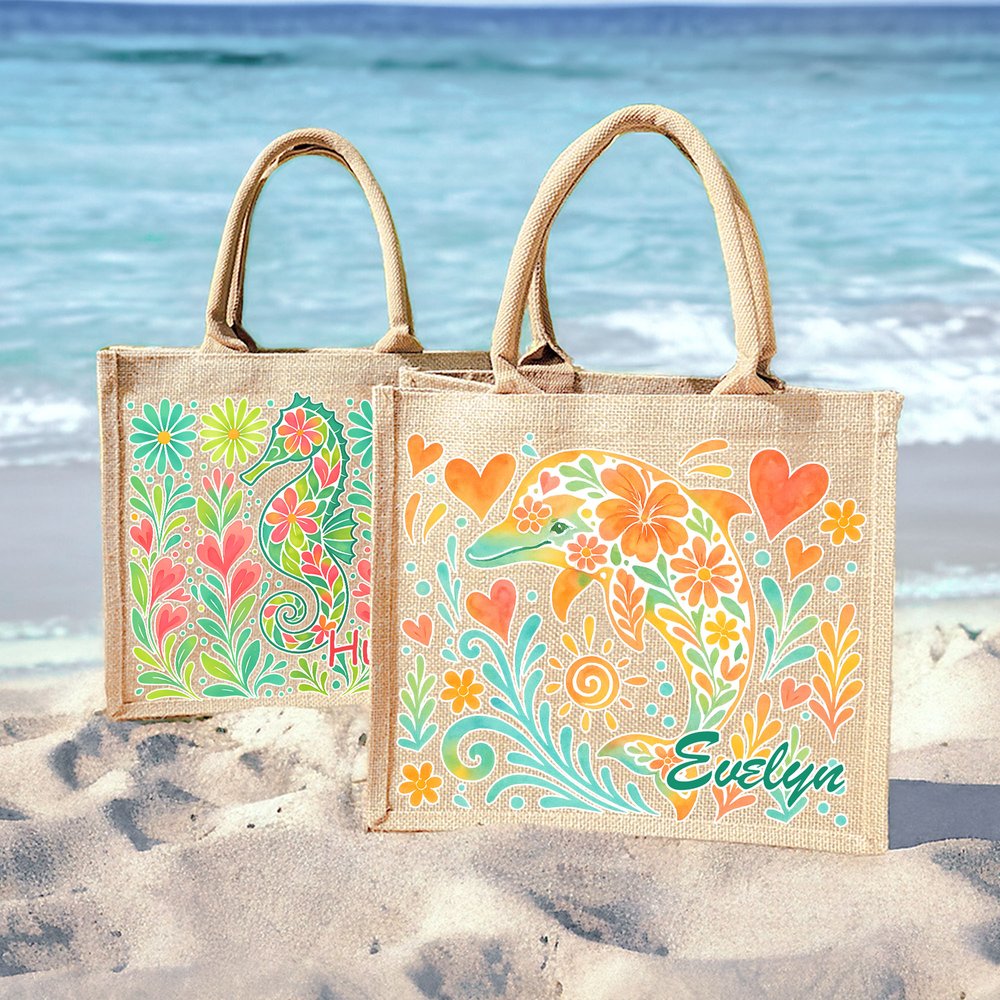 Personalised Marine Animal Patterns Large Jute Tote Bag with Name Beach Party Essential Birthday Anniversary Travel Gift for Women Friends