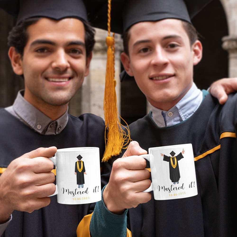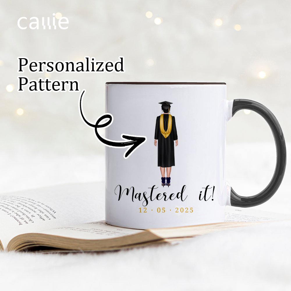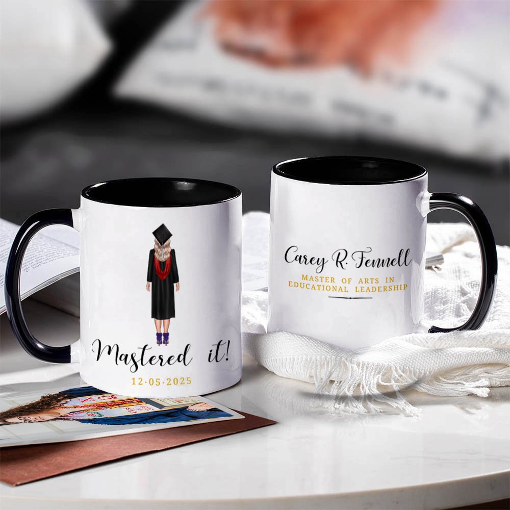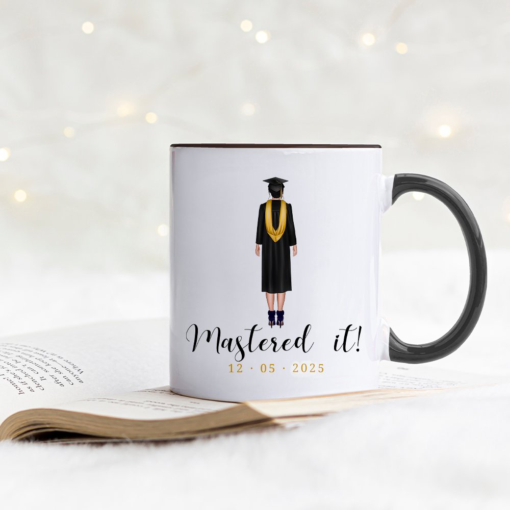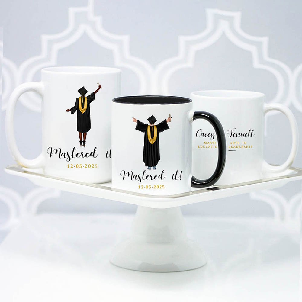 Our Personalised Mastered It Degree Graduation Ceramic Mug features a sleek design with a white ceramic background, black handle, and black interior. The front of the mug features the words "Mastered It" on front and the back of the mug features the name and degree title of the graduate. This Personalised touch makes it an extra special gift that will be treasured forever.