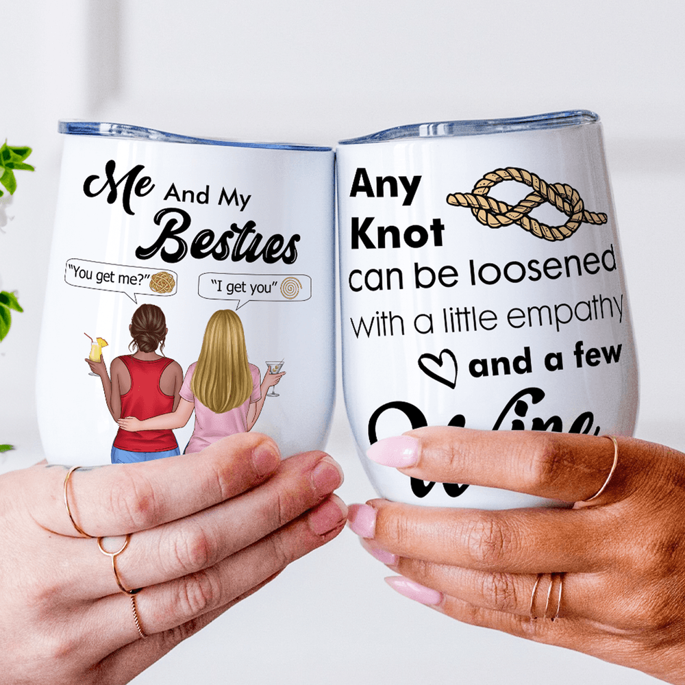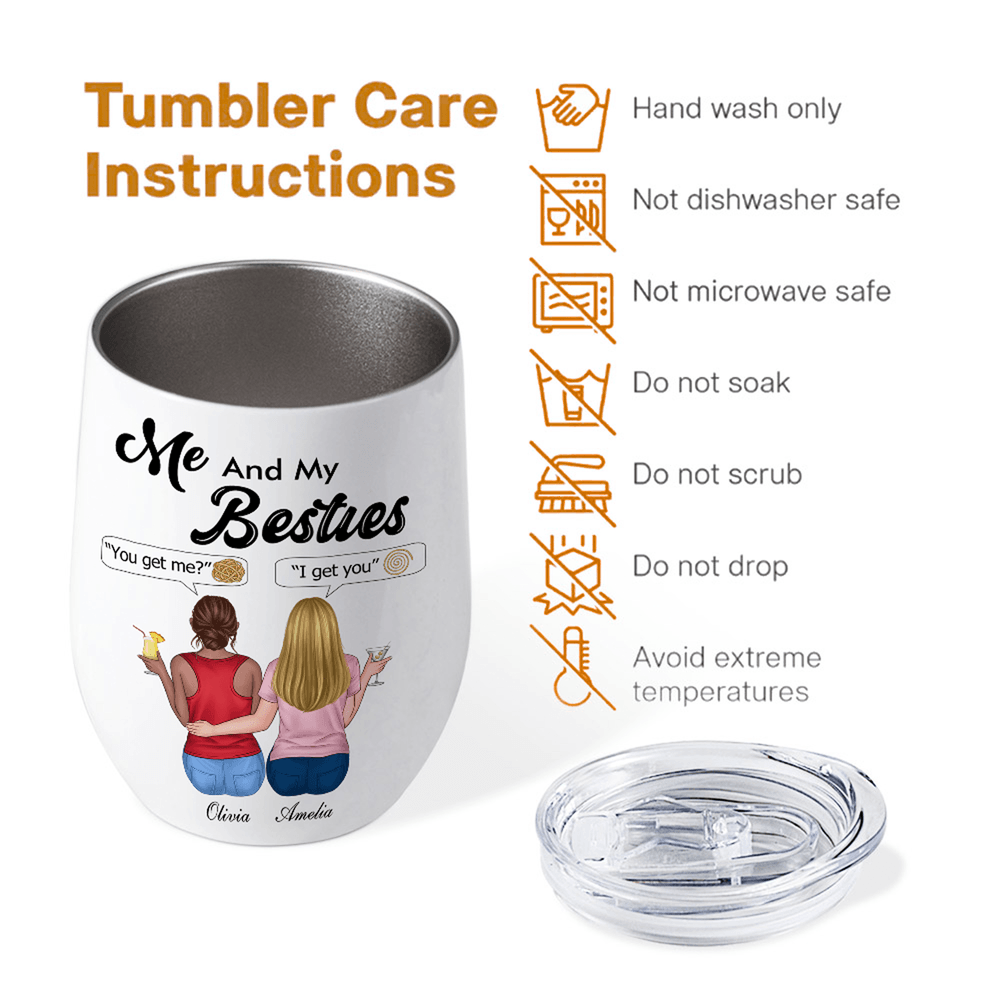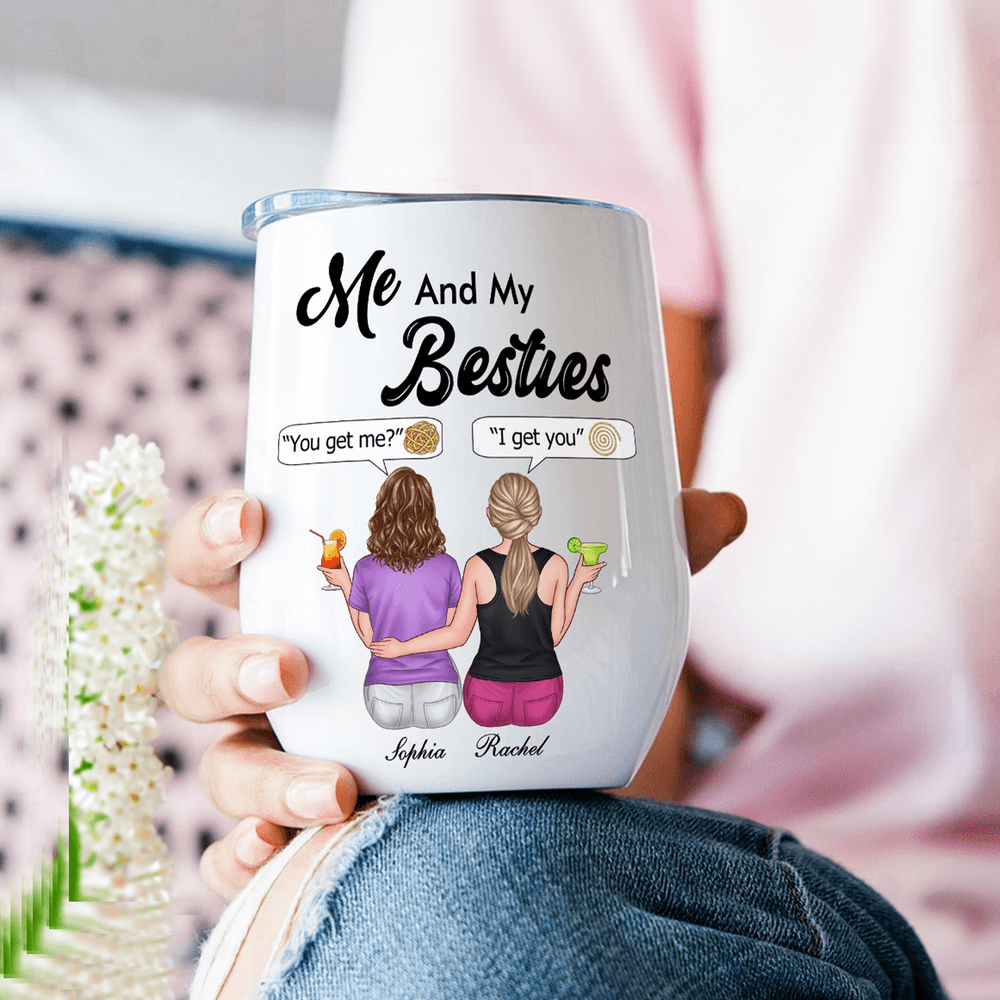 Celebrate the bond of true friendship with this "Me and My Besties" tumbler, featuring the text "you get me? I get you," — a perfect representation of your unspoken connection. Customize it with your names to create a one-of-a-kind token of your friendship. The charming illustration of best friends from behind adds a warm, personal touch, turning every sip into a special shared moment.