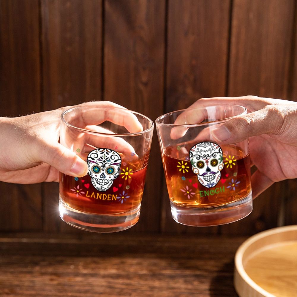 Featuring a beautiful Mexican floral sugar skull design, this whisky glass can be customized with your name. It adds a meaningful and personal element to any festive decor.