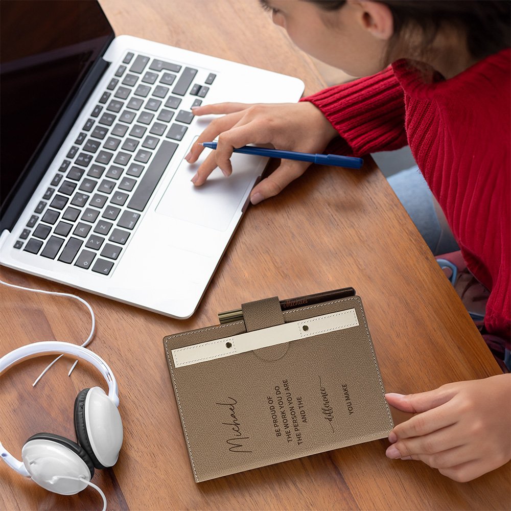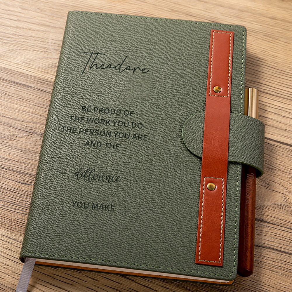 The notebook and pen can be customized with individual names, creating a personal connection to each piece. The motivational text adds an inspiring element that encourages pride and dedication in daily work. Professional personalization makes it a meaningful tool for workplace success. Cover fixed text" Be proud of the work you do, the person you are, and the difference you make".