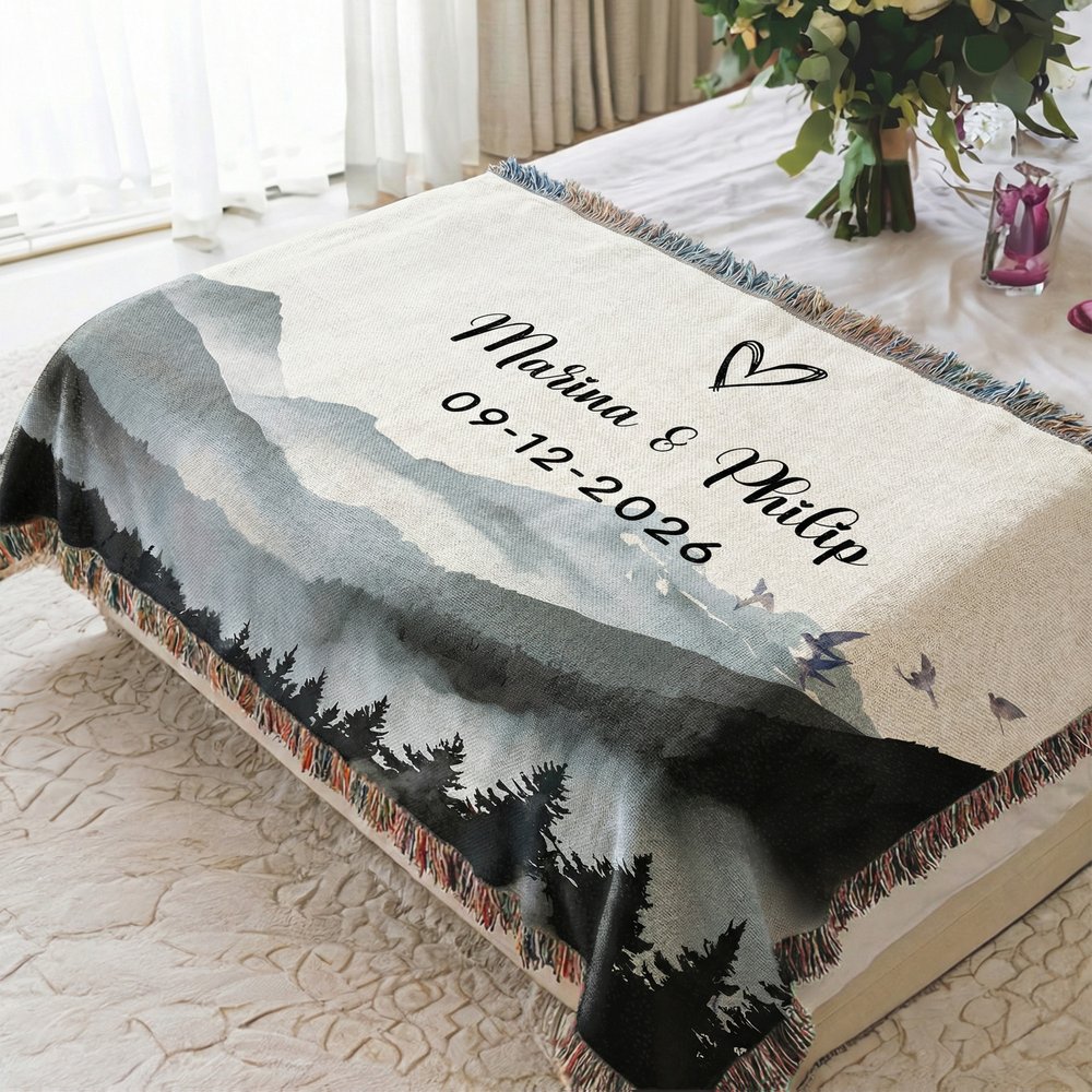 The blanket features a continuous mountain silhouette as its core pattern, symbolizing love as steadfast and enduring as the mountains and hills. It supports Personalised couples' names and significant dates, weaving unique emotions into a simple yet elegant visual language, creating a warm keepsake that carries vows and memories through time.