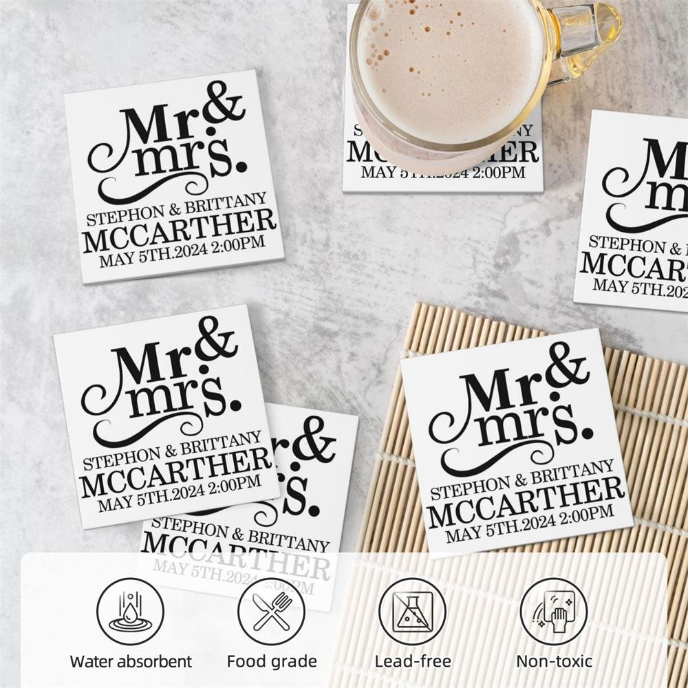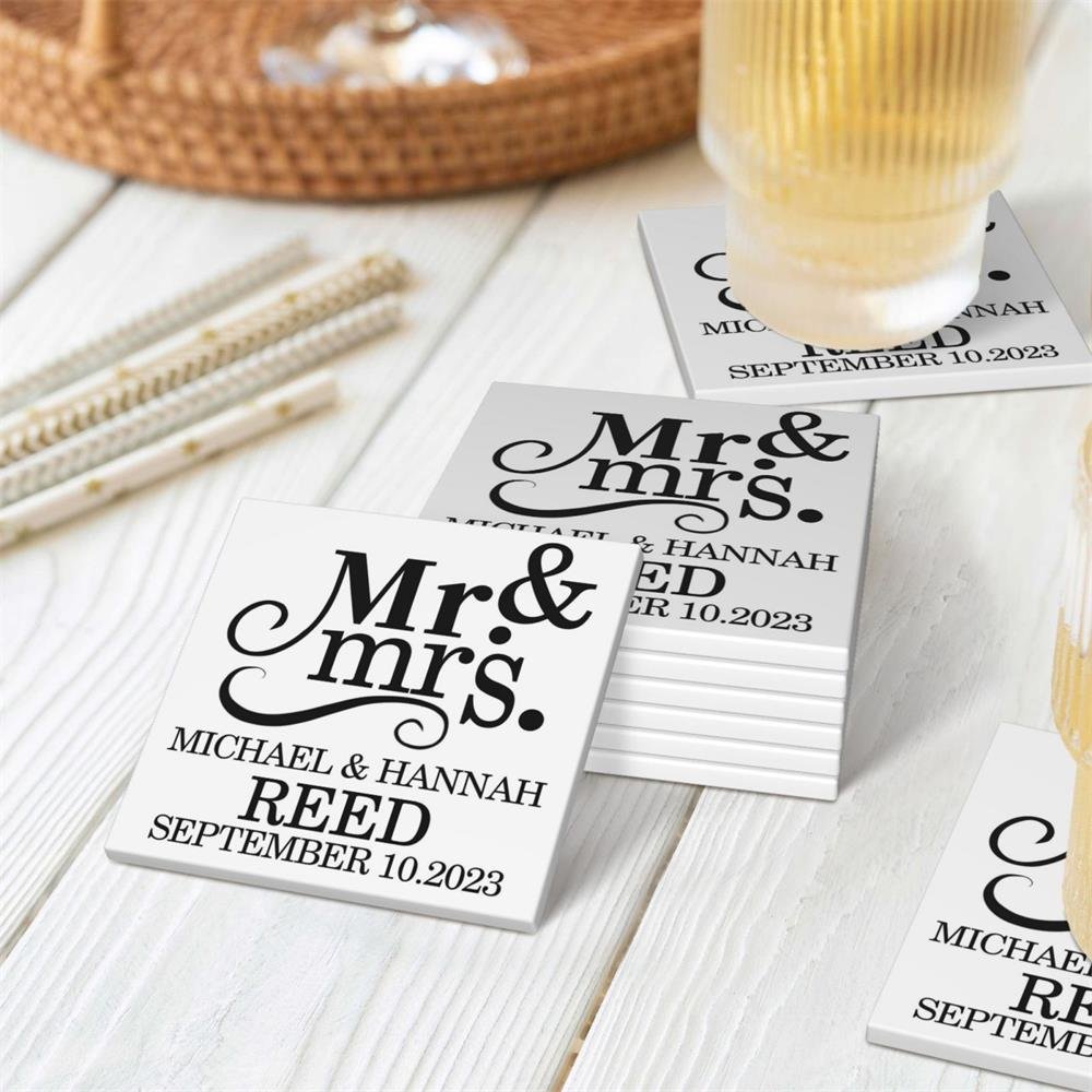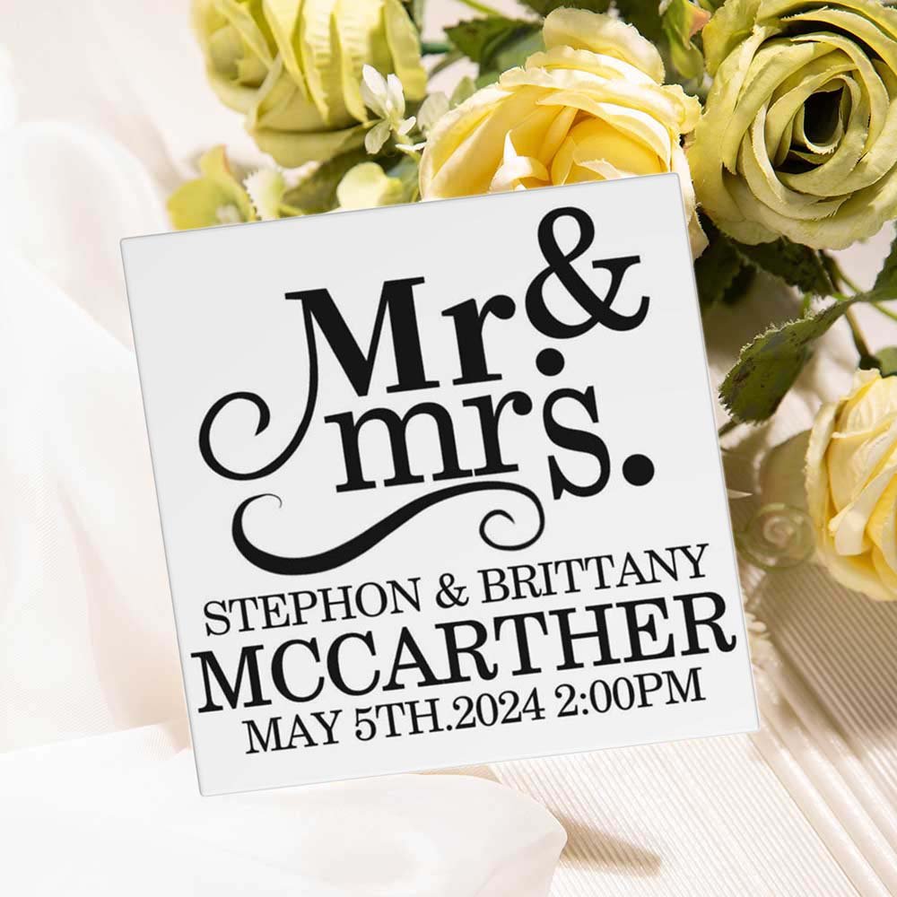 This set includes four square-shaped coasters that blend functionality with timeless style. Each piece features "Mr. & Mrs." lettering paired with a custom couple's surname, first names, and wedding date, transforming them into cherished keepsakes. Every use evokes memories of that special day, forever celebrating your love story.