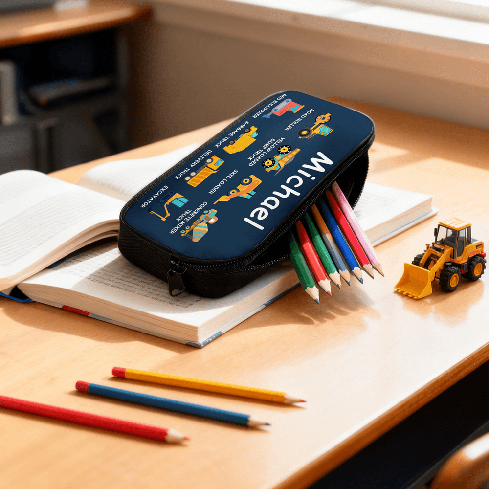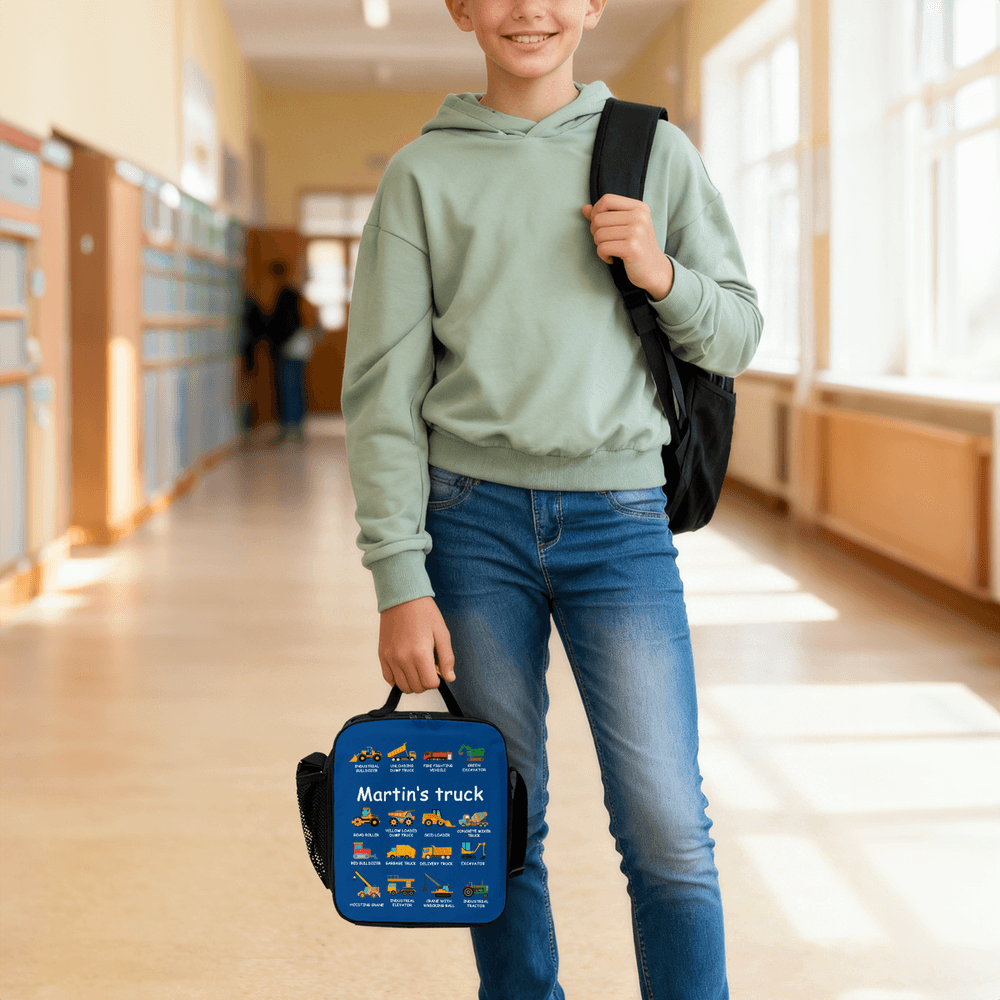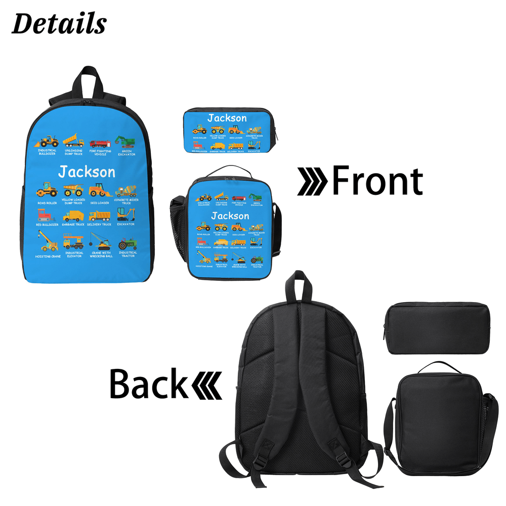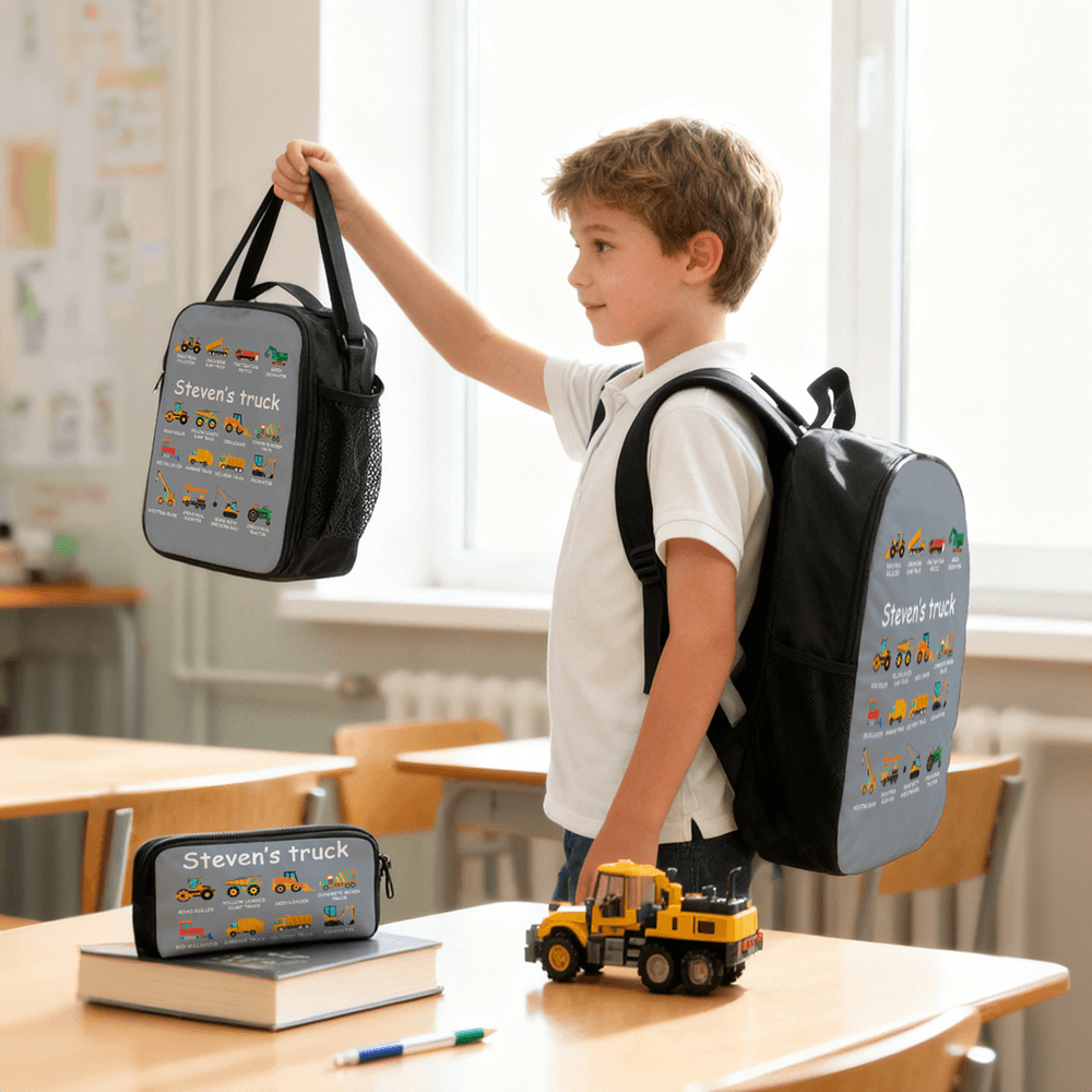 This three-piece set features a construction vehicle theme paired with vibrant colors and patterns, tailored to reflect your child's personality. The set can be Personalised with a name, turning the backpack, pencil case, and lunch bag into unique pieces that showcase their individual style, helping them shine confidently in daily life.