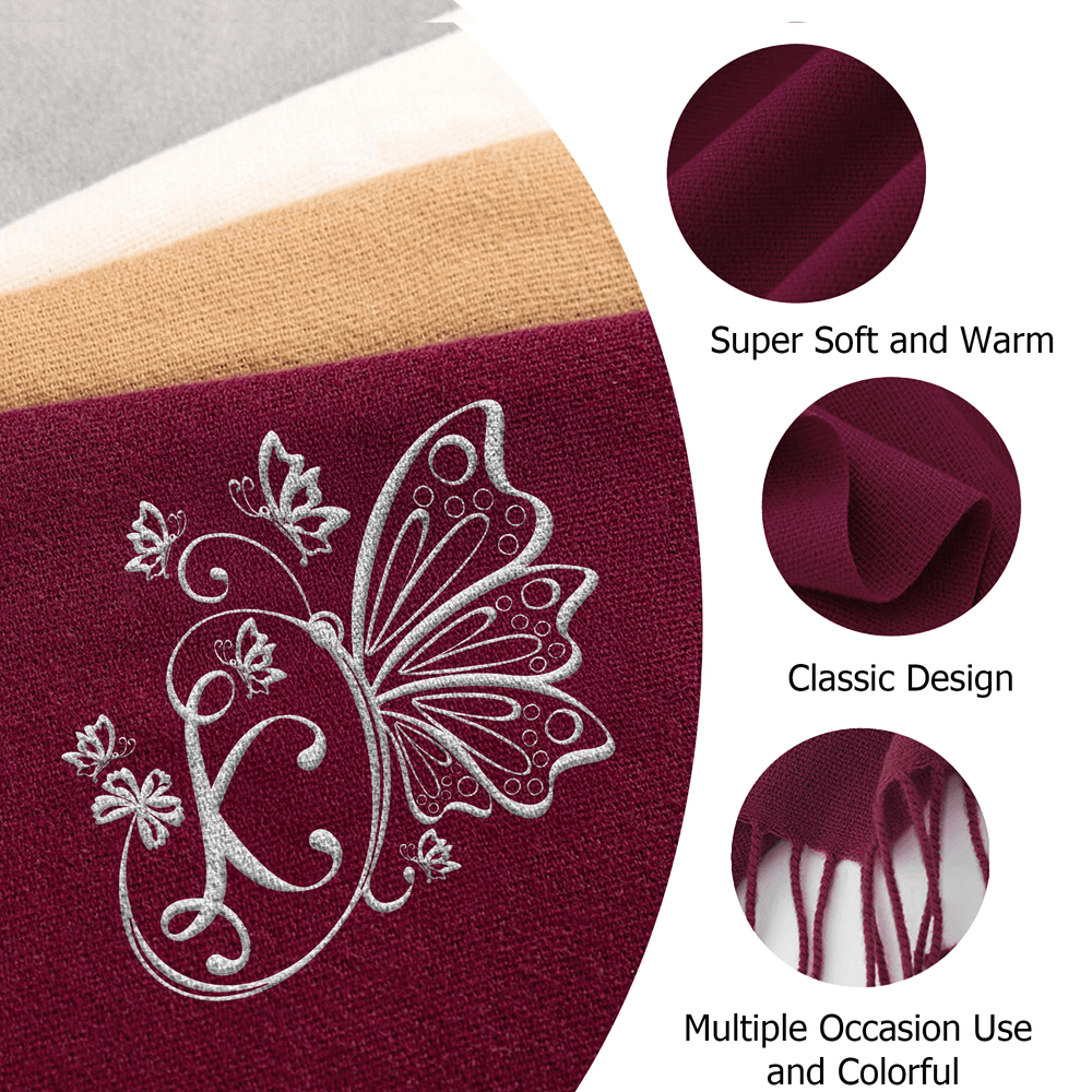 Personalised Multicolour Butterfly Embroidered Initial Soft Warm Scarf with Tassel Winter Accessory Anniversary Birthday Gift for Women