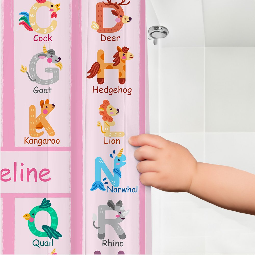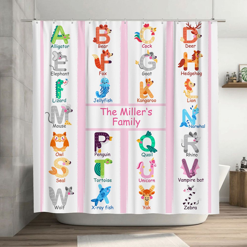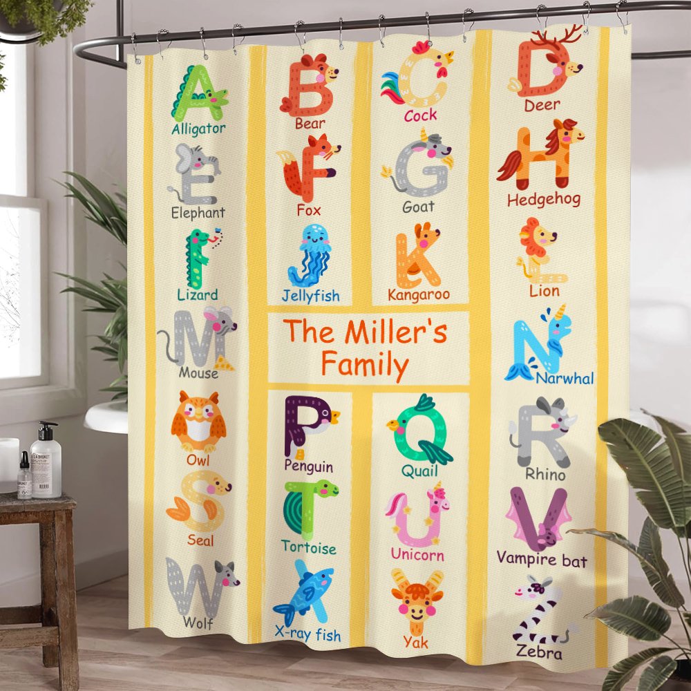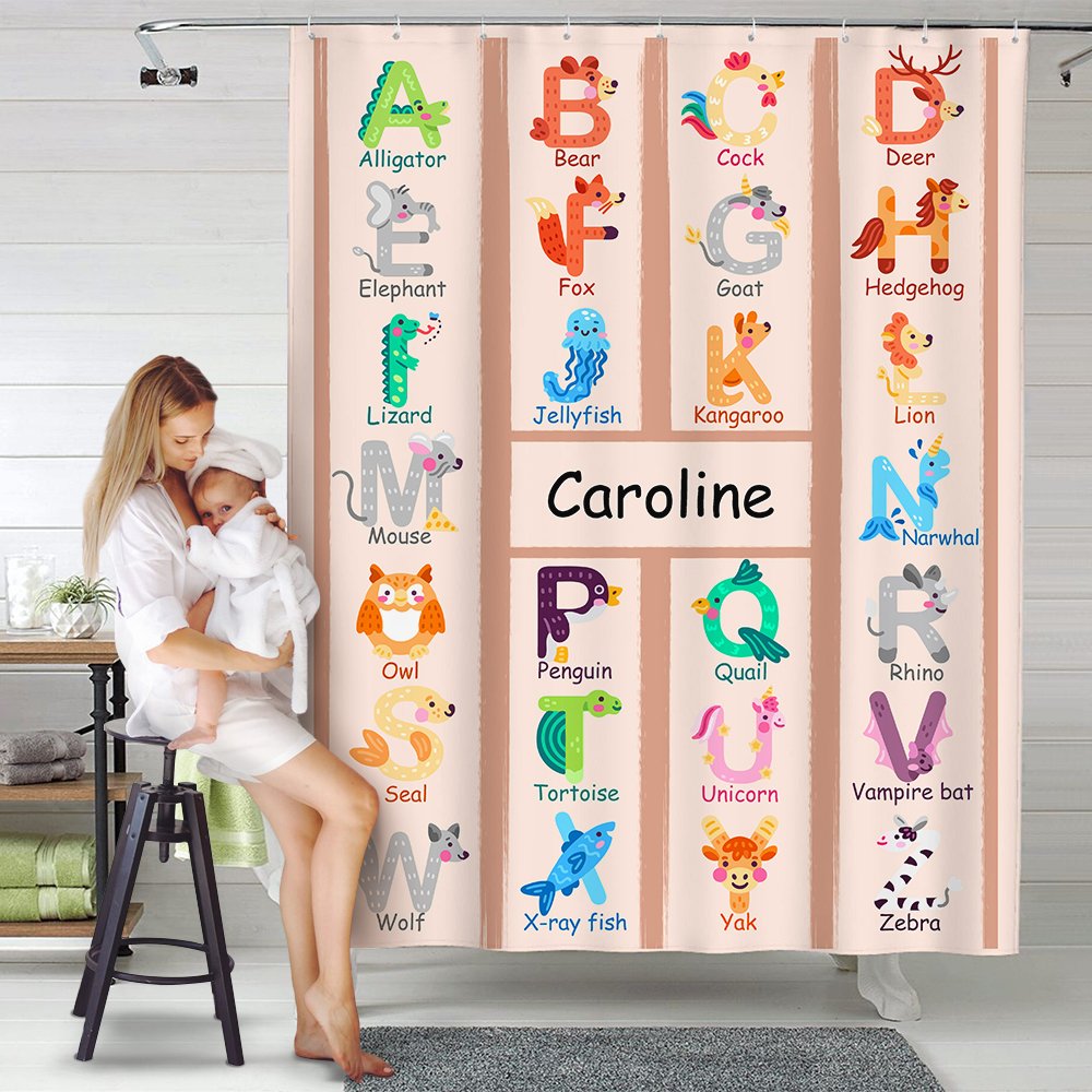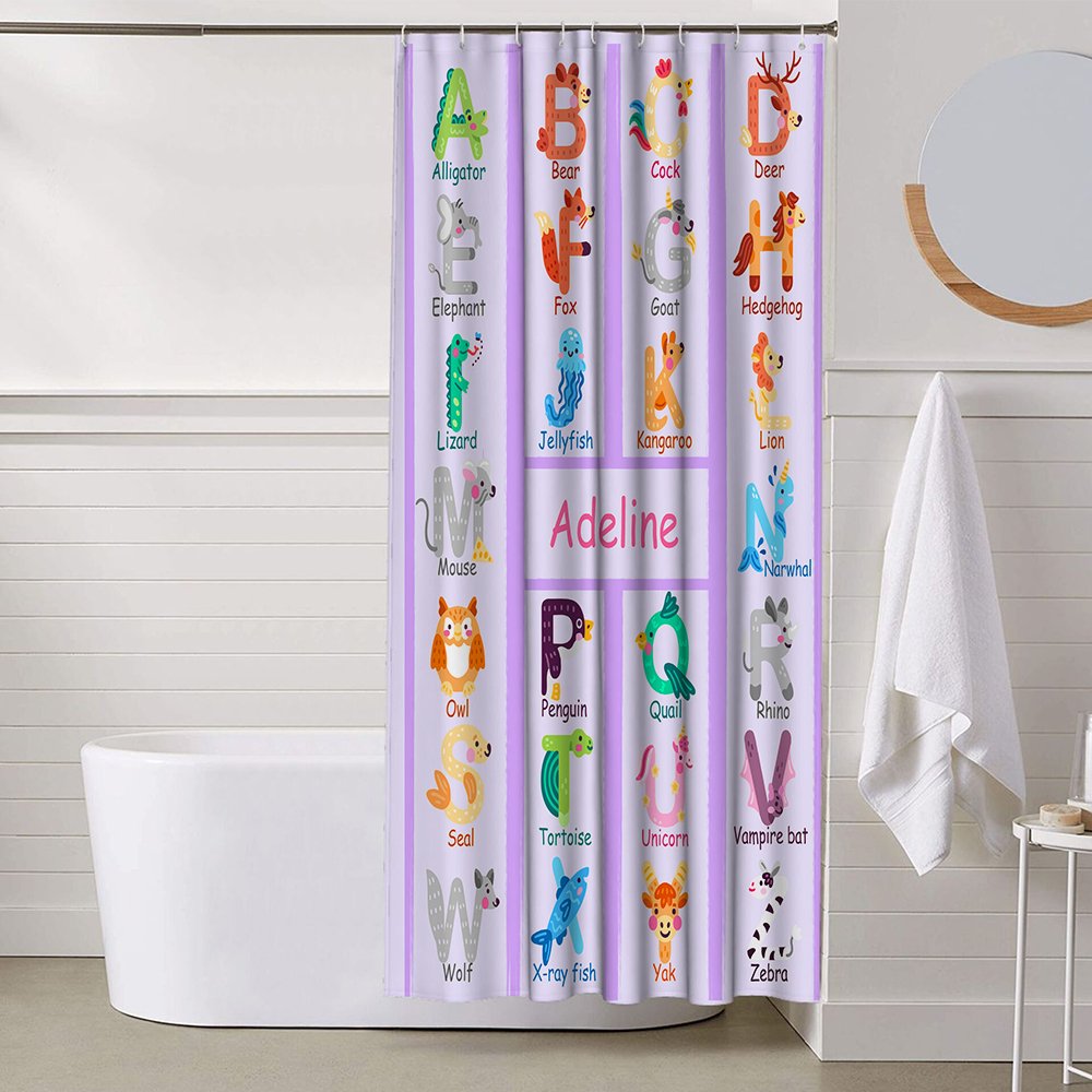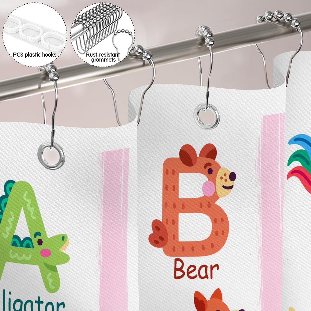 This unique shower curtain features 26 letters of the alphabet, each accompanied by adorable cartoon animals. It's perfect for preschoolers, helping children learn their ABCs and animal words while making bath time enjoyable and educational.