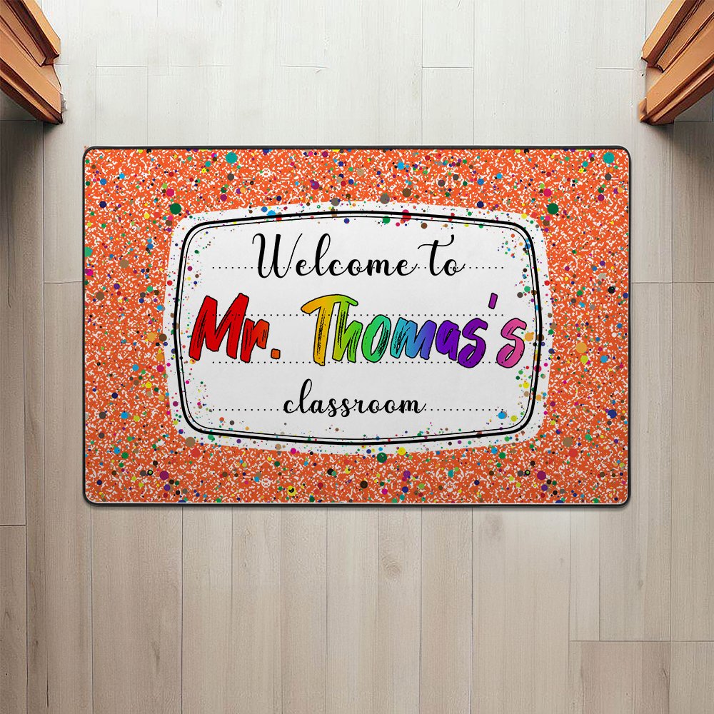 This doormat is in the style of composition book elements in rich and bright colors." The set text of "Welcome to class" makes everyone who enters the classroom feel your warmth and friendliness. Use your teacher's name to make the doormat even more special.