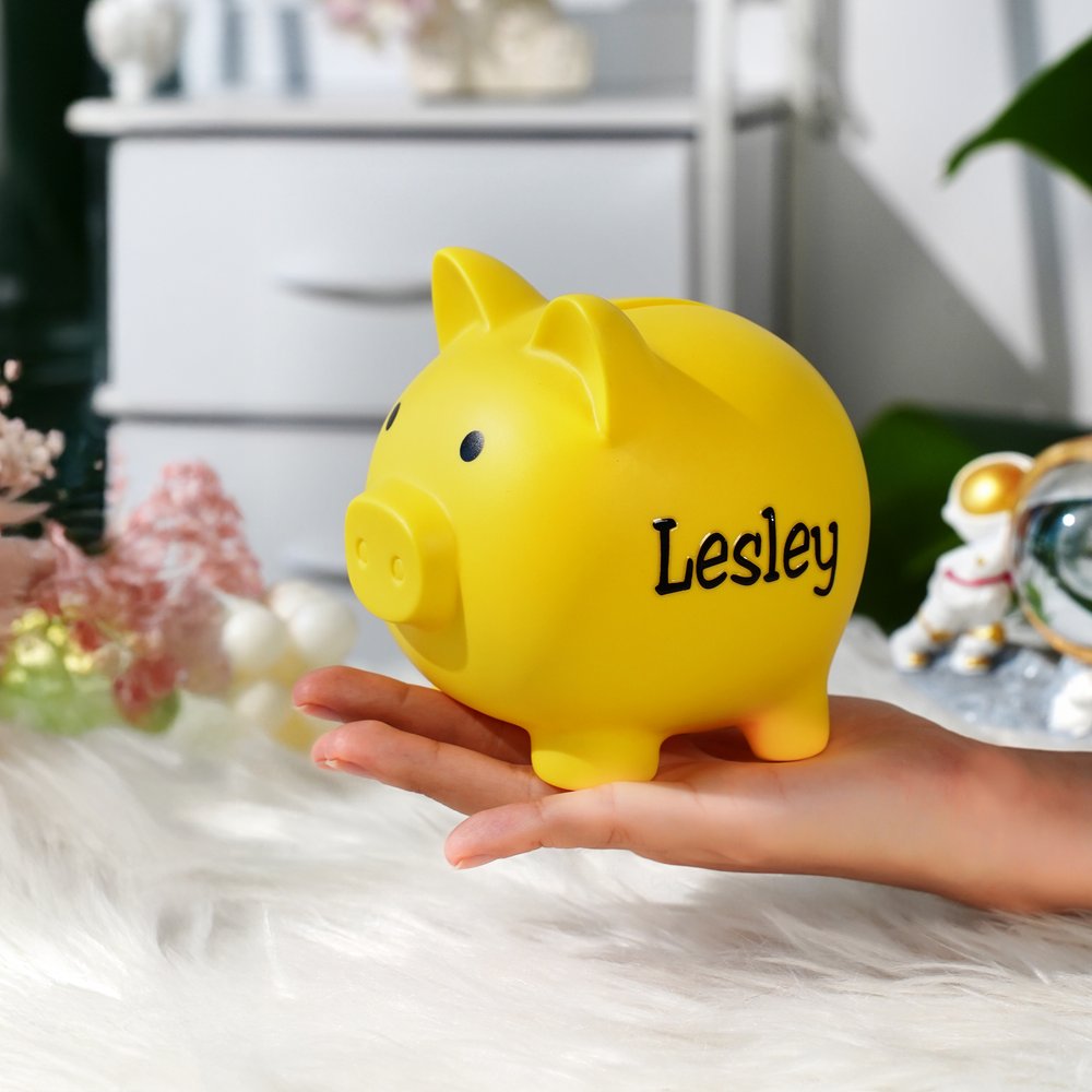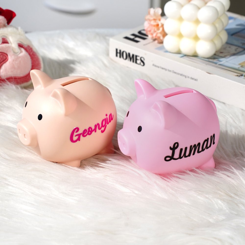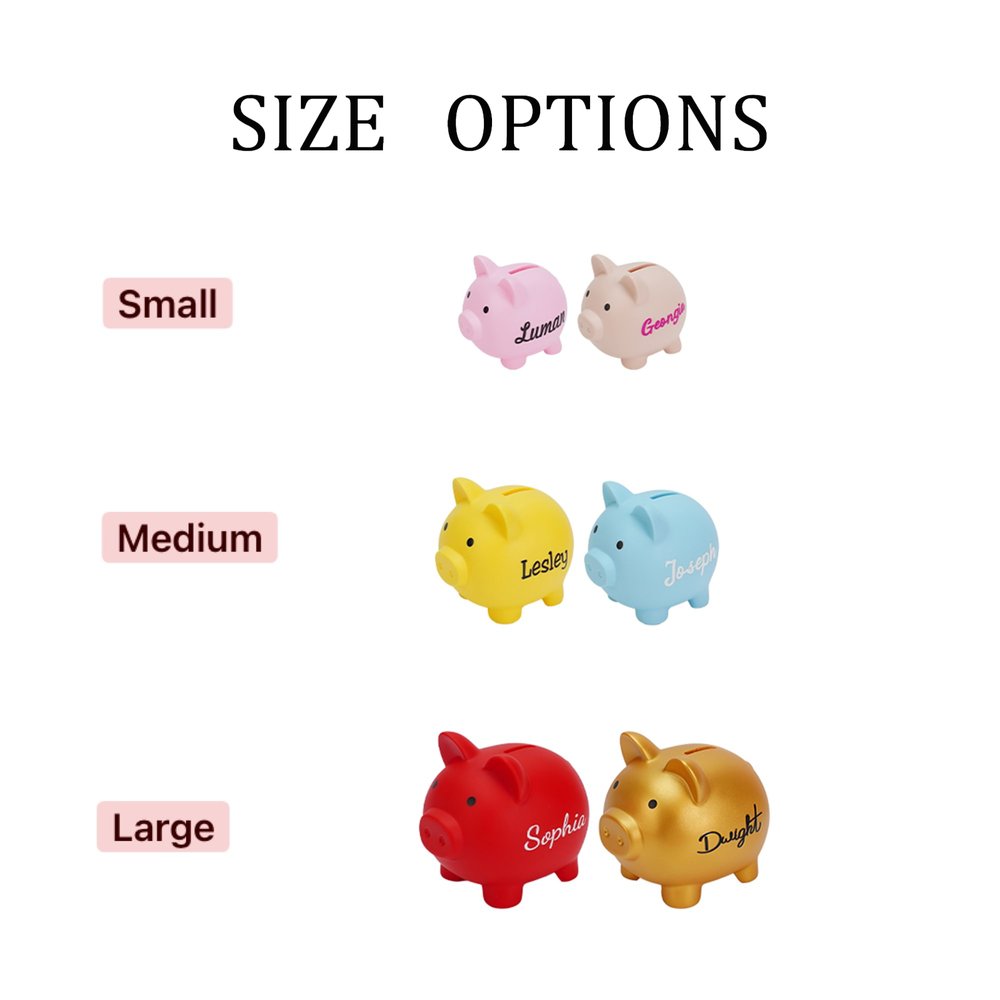Featuring a classic piggy bank design, this sleek, adorable piggy bank with vibrant colours instantly captures children's attention. Available in a variety of colours, including red, blue, pink, and so on, it caters to every child's taste. Customizable names make each piggy bank a unique gift.
