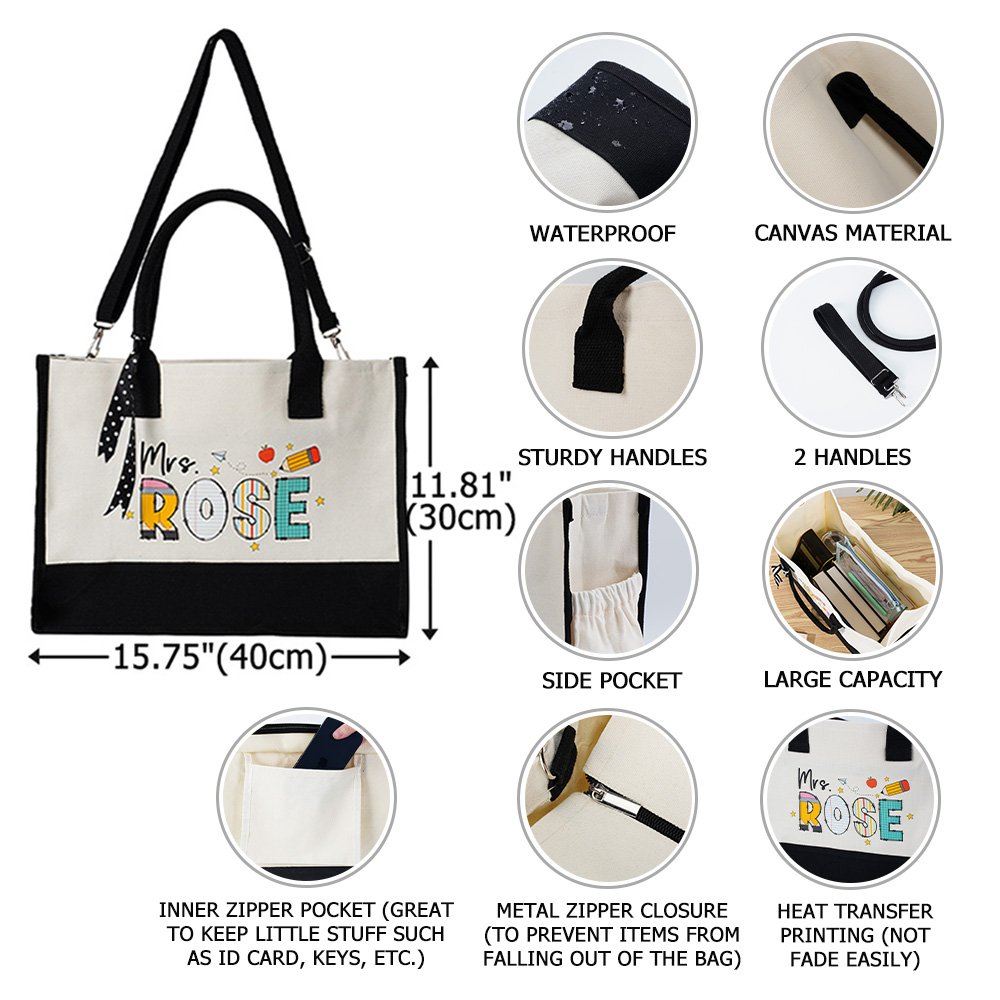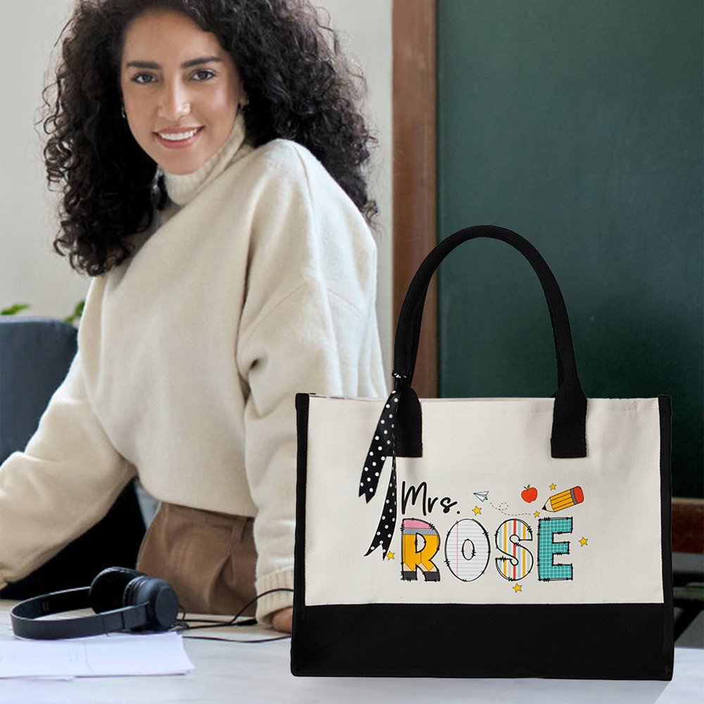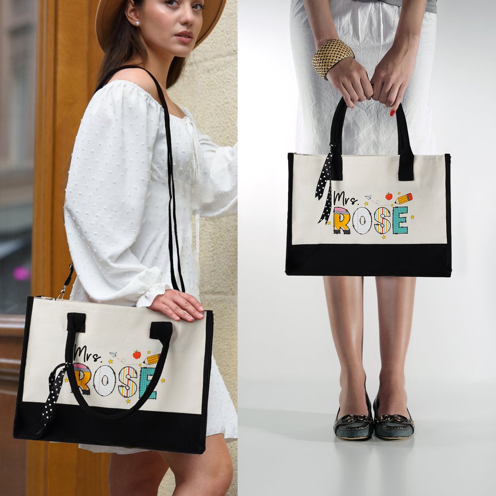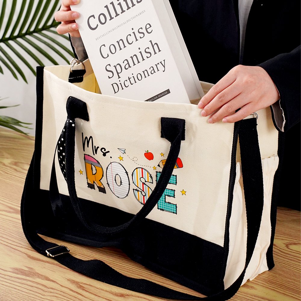 Personalised Multicolor Doodle Text Large Canvas Tote Bag with Shoulder Strap Birthday Teacher's Day Back to School Appreciation Gift for Teachers