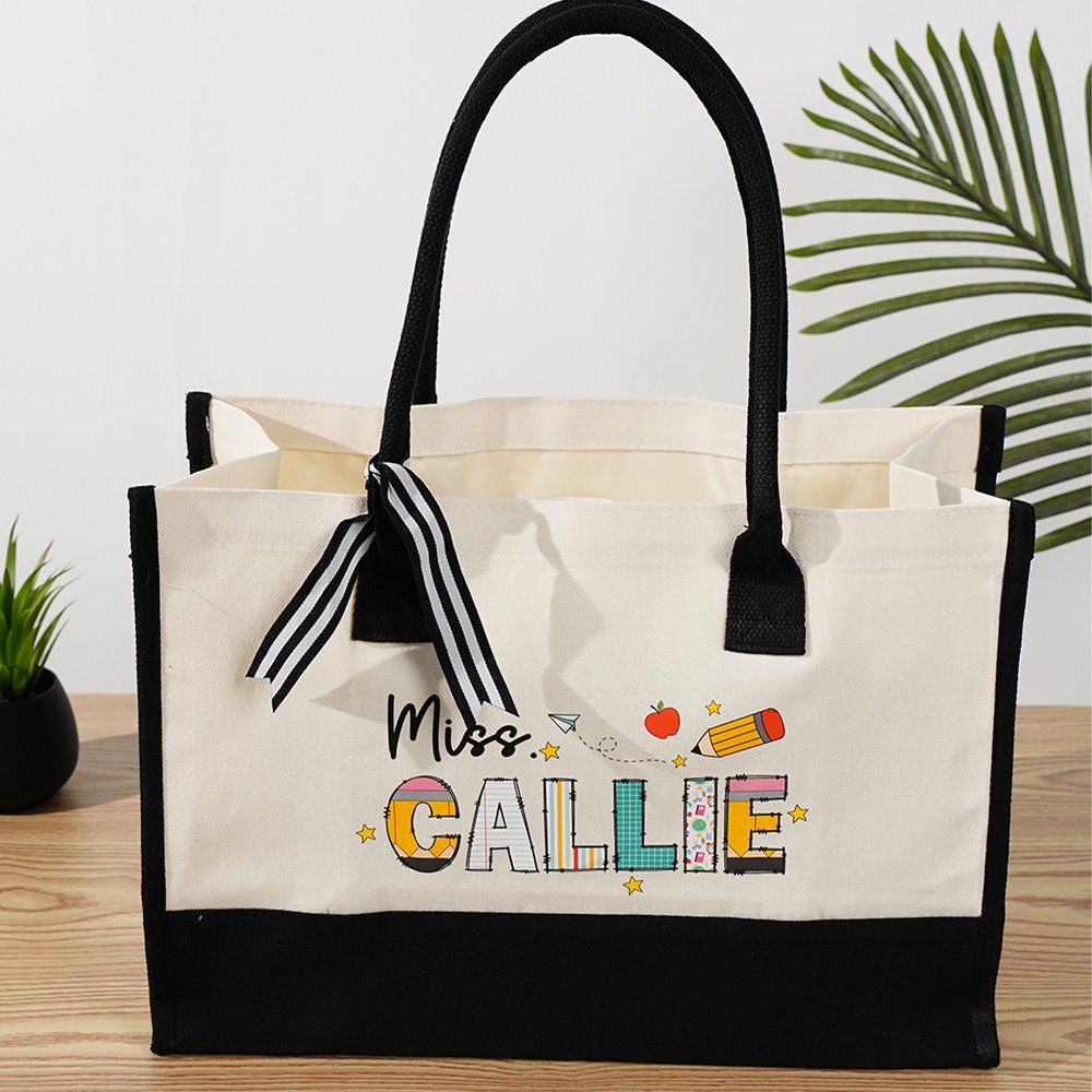 This tote bag features a customized text, adding a personal touch. The letters incorporate stationery elements like pencils, book pages, and grid motifs, adorned with small apples, pencils, stars, and paper airplanes. The overall design celebrates the teaching profession, making it a perfect gift for teachers or educators.