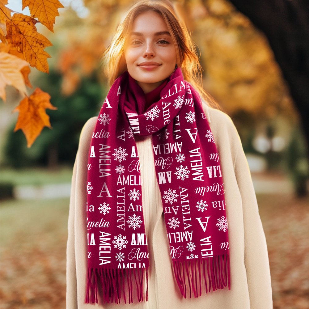 This word cloud scarf is available in a variety of colors and features a name and initial combination. The snowflake pattern adds a festive touch and is both a fashion statement and a personal keepsake. This customization ensures it reflects the taste of the recipient.