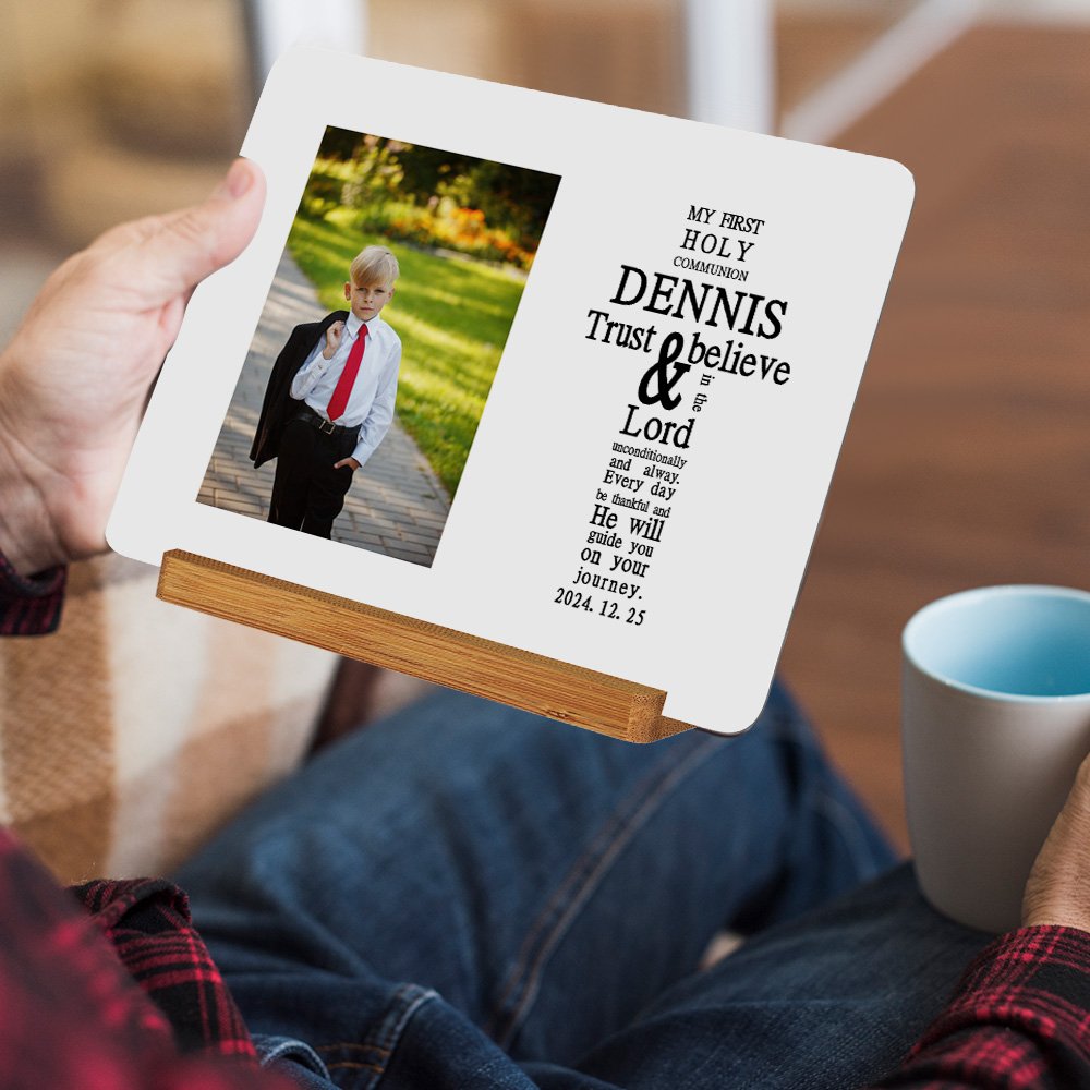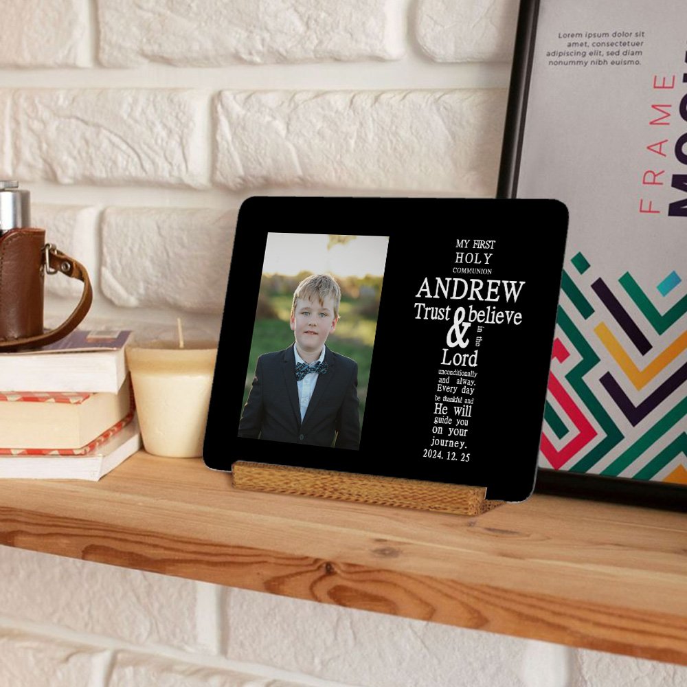 This frame features a cross-shaped arrangement of text, prominently displaying the sacred phrase "MY FIRST HOLY COMMUNION." Accompanied by a charming themed photo, it offers an elegant and artistic presentation. You can customize it with your child's name and date to celebrate the beautiful moment of their first communion, creating a treasured keepsake.