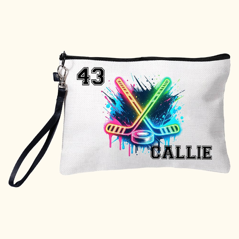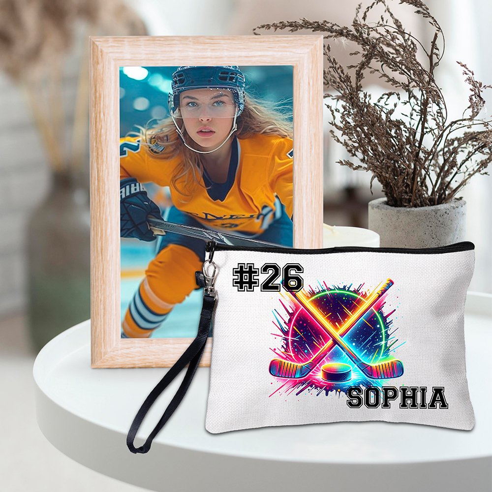 Our cosmetic bag is simple, with a sporty hockey pattern printed on the front. The cool neon color combination is very sporty and modern technology style. You can customize your or your friend's name and number on the cosmetic bag to create a unique souvenir, making it a fashionable, elegant, and unique lifestyle accessory.