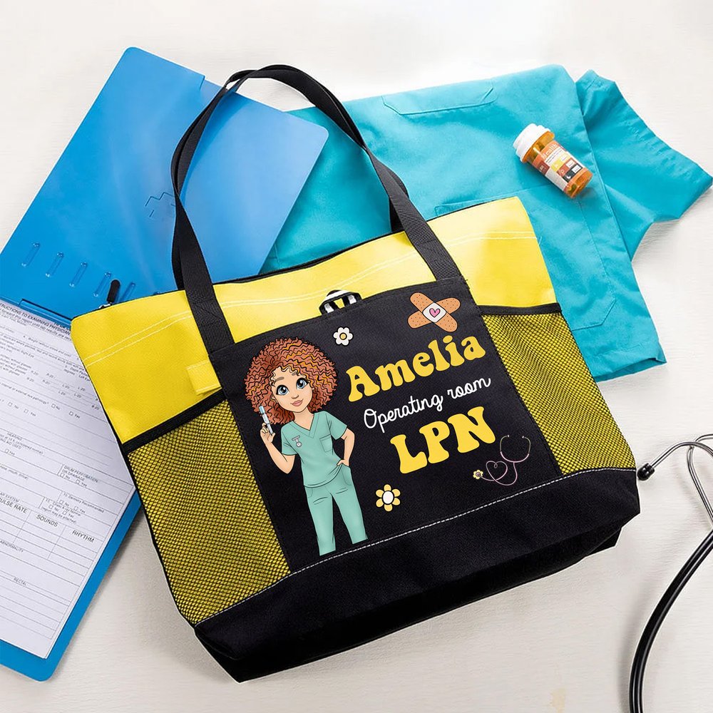 This tote bag features a cartoon-inspired design and can be customized with a cartoon nurse image, including your name and position. Decorated with medical elements like a stethoscope and Band-Aids, along with floral accents, it embodies the hallmarks of the medical profession while adding a playful and warm touch. This unique and personal touch makes the bag both memorable and personal, alleviating the stress of work for healthcare professionals.