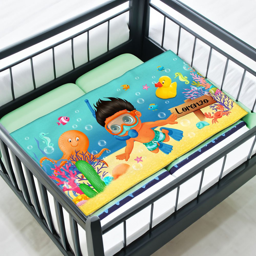 Featuring vibrant colors, adorable patterns, and images of children, this towel has a diving theme with marine flora and fauna. The towel can also be Personalised with a child's name to create a towel that is perfect for children to use for swimming or in their daily lives.
