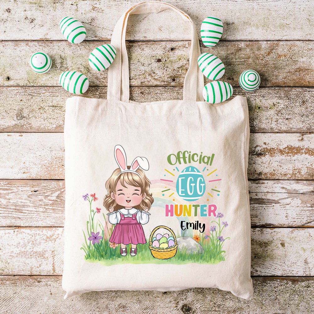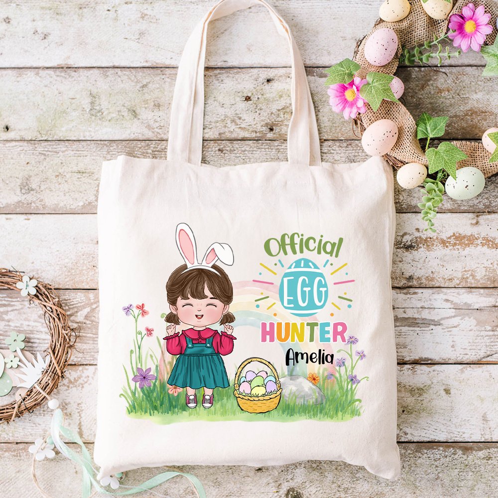 This tote bag features a playful egg hunter cartoon character and adds a whimsical touch to Easter festivities. Kids will love carrying their treasures in a bag that reflects their personality and excitement.