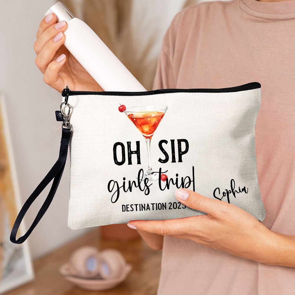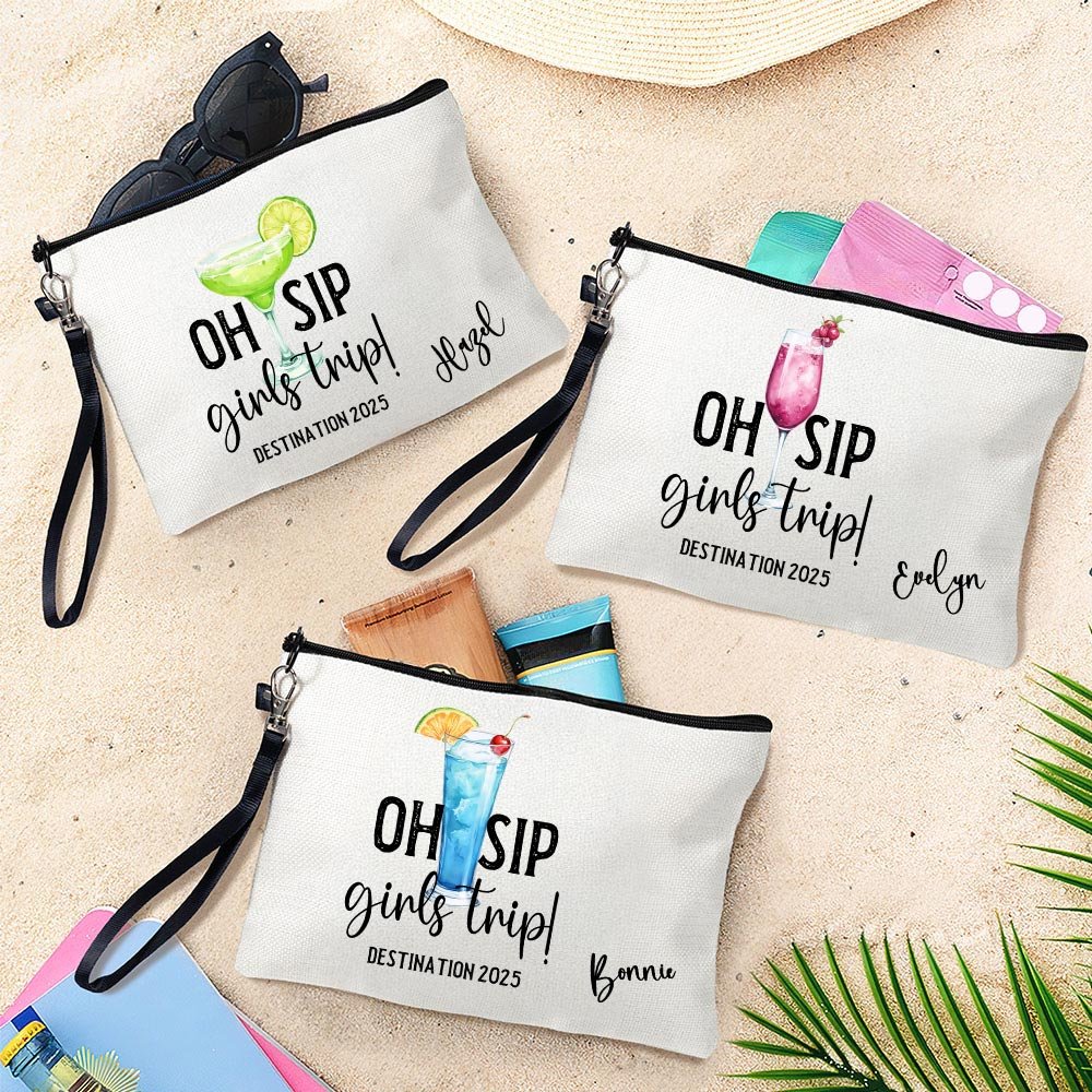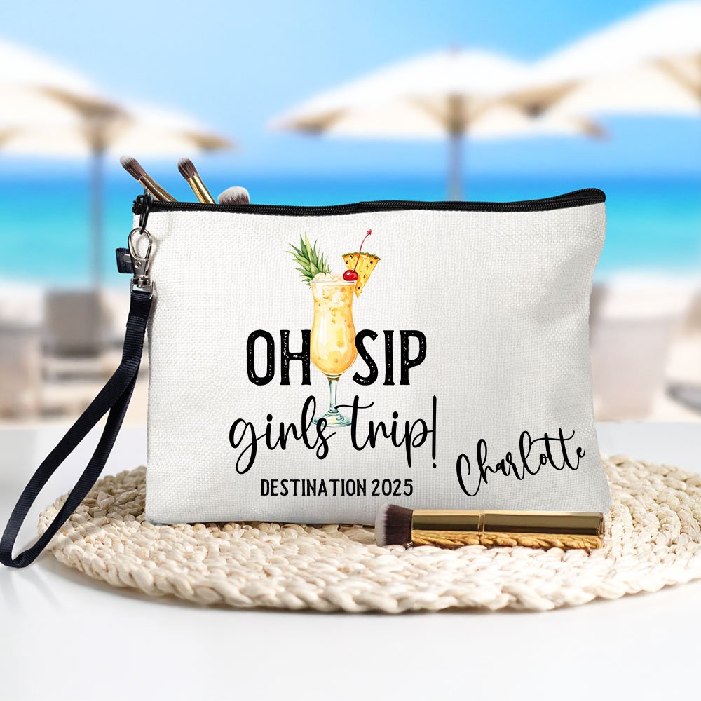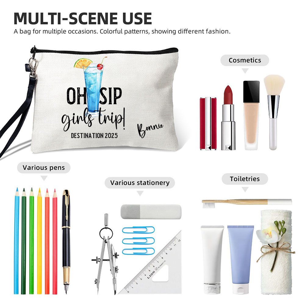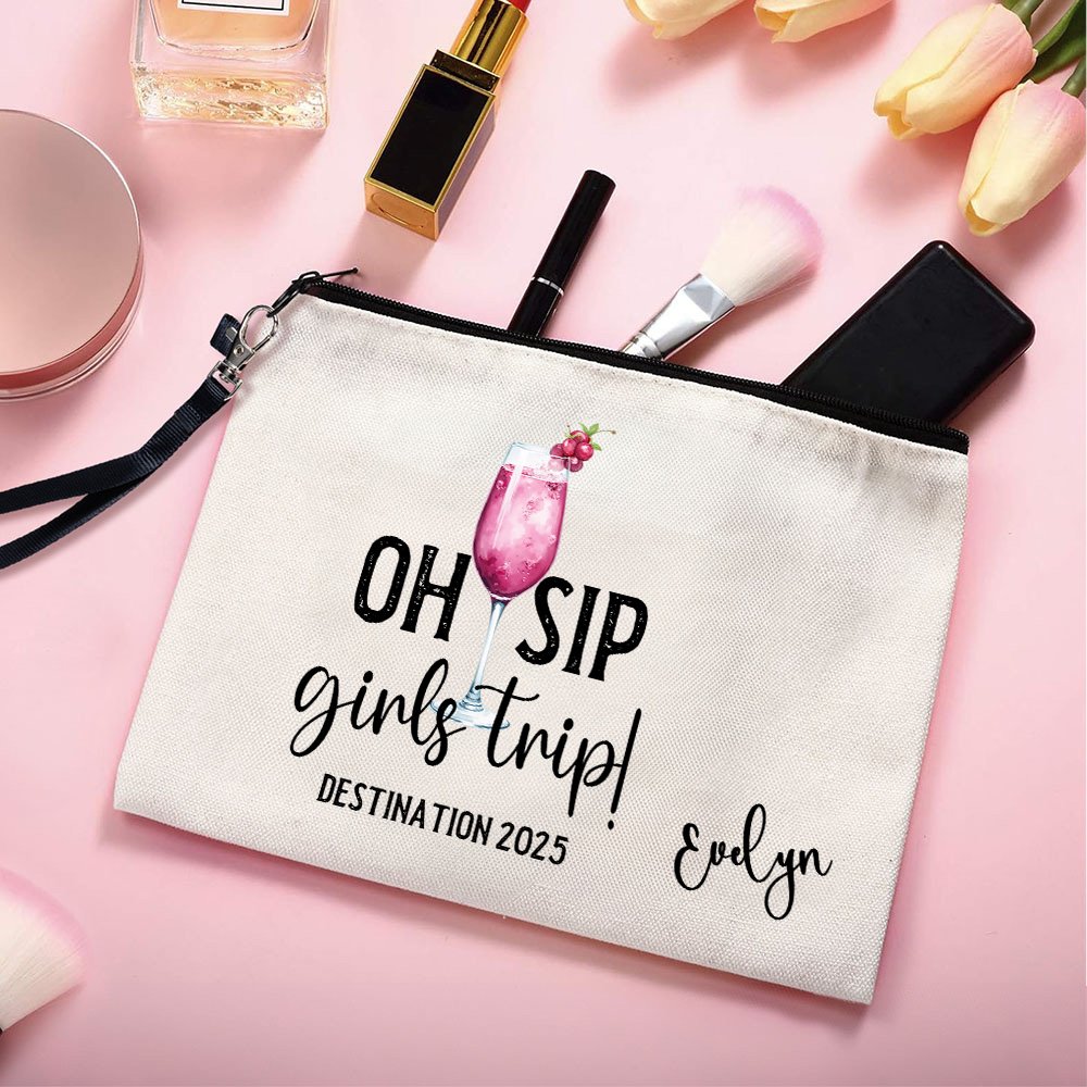 This portable makeup bag can be Personalised with your name, making it a truly unique accessory. Featuring the fixed text "Oh Sip Girls Trip!", you can also customize the travel destination and date, showcasing the special bonds of friendship among girls.