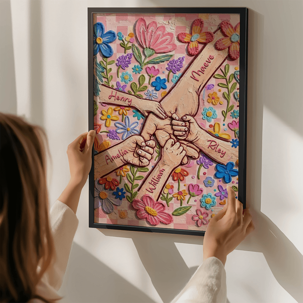 The core of the image is a heartwarming scene of a parent and child holding hands. The mother and child's arms are intertwined and tightly clasped, with soft and delicate lines that vividly convey the unity and warmth of the family. Each arm can be customized with the name of a family member, transforming an ordinary canvas painting into a unique keepsake and a one-of-a-kind token of affection.