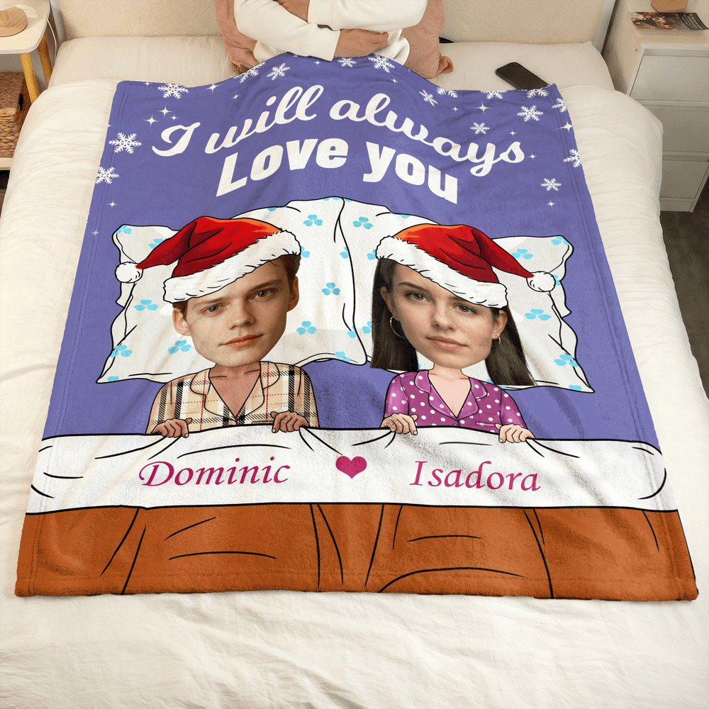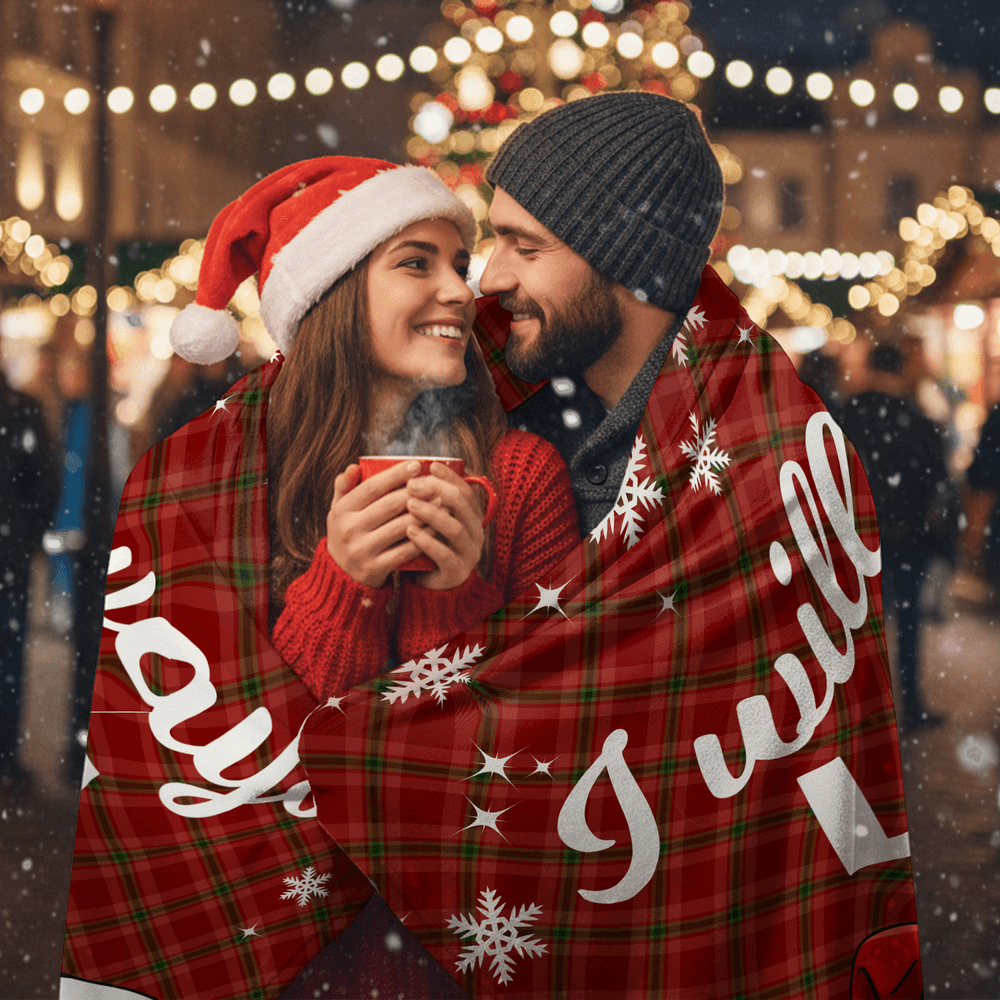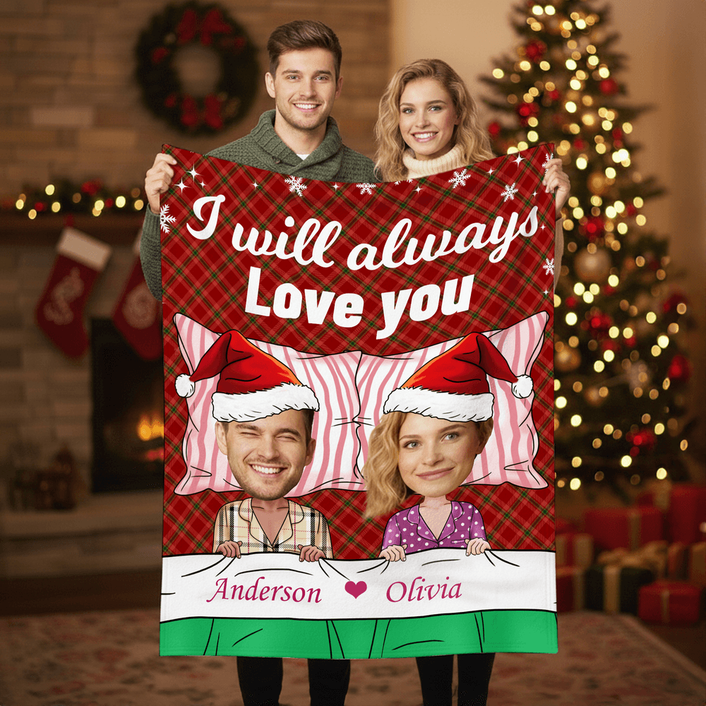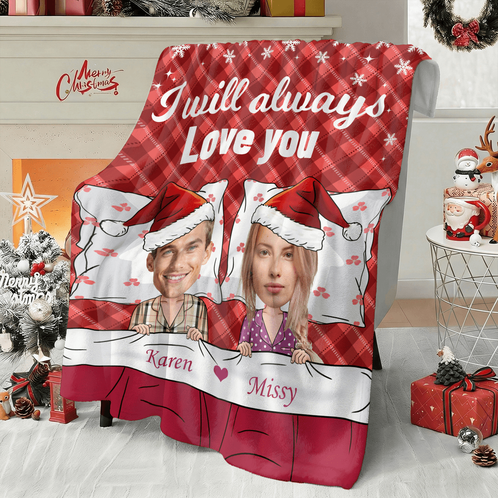 Designed with a festive Christmas plaid or solid-color background and delicate snowflakes, this Personalised blanket features a pyjama-clad couple in Santa hats—customize with a photo face and names to create a warm, couple-inspired look that feels truly personal.