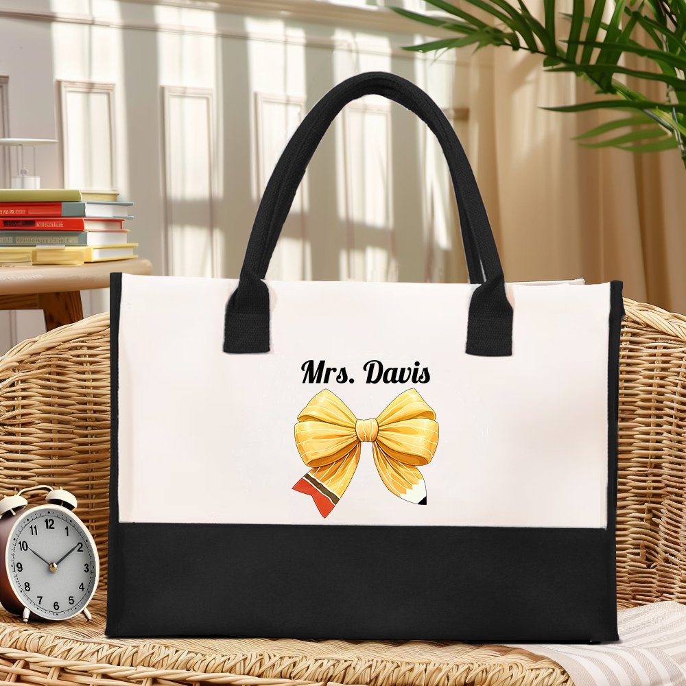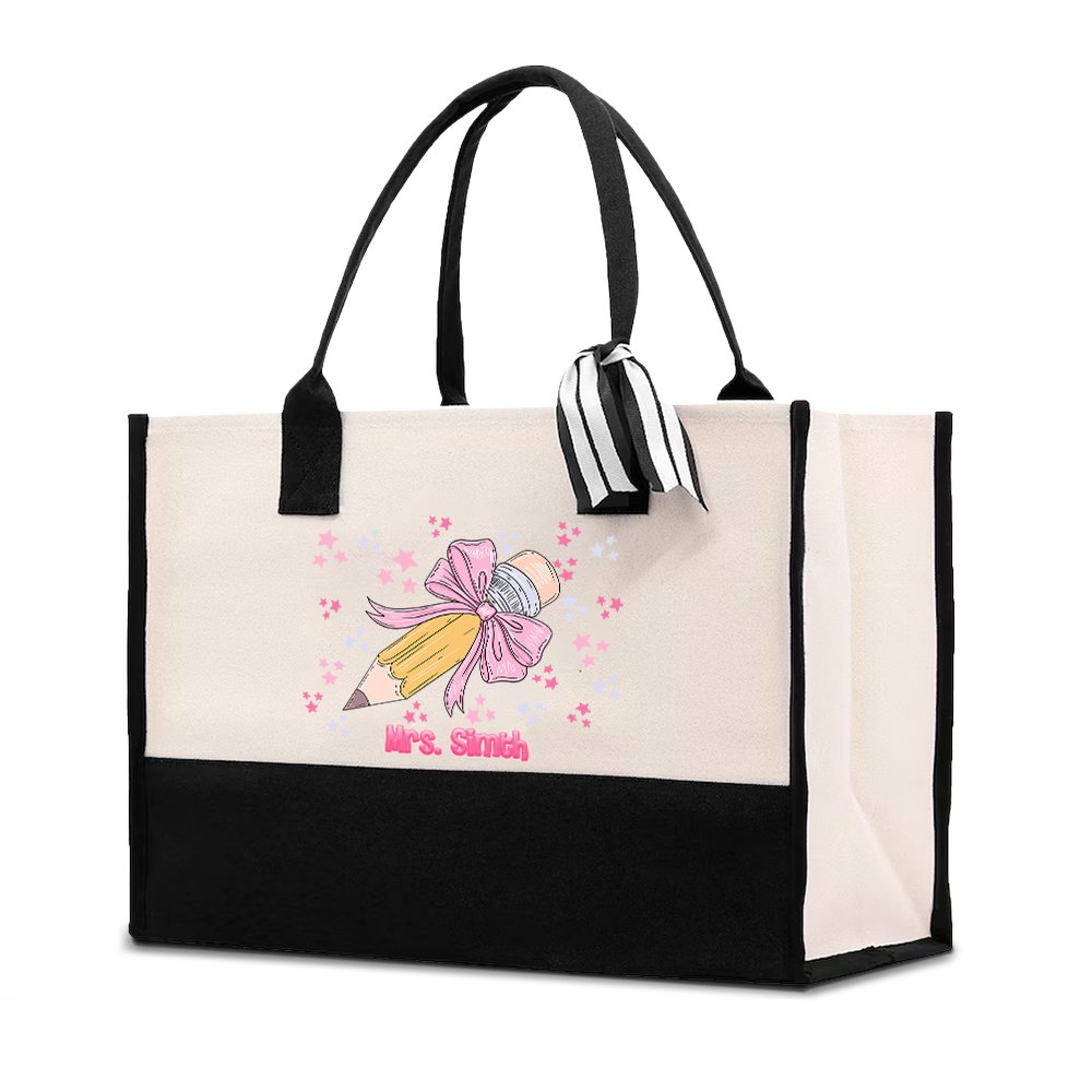 An adorable pencil coquette design adorns this canvas tote, making it both playful and stylish. Personalise it with the teacher's name to create a unique and thoughtful gift.