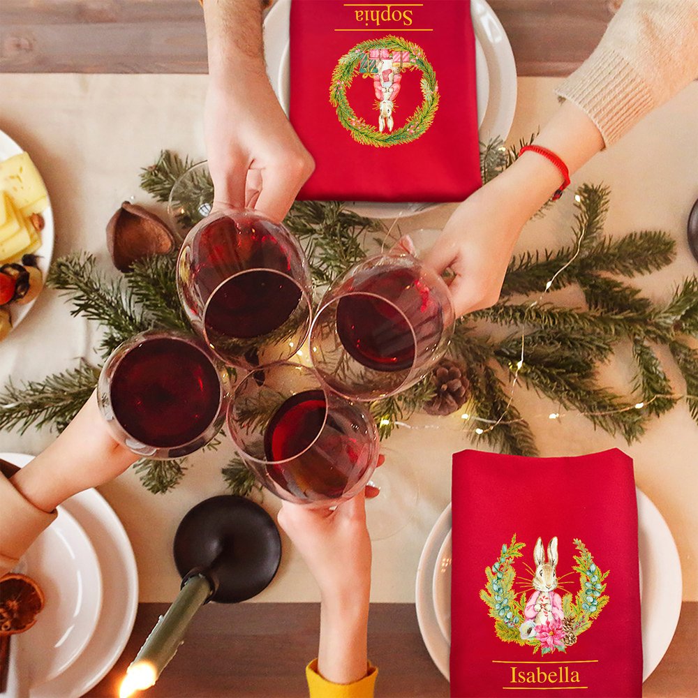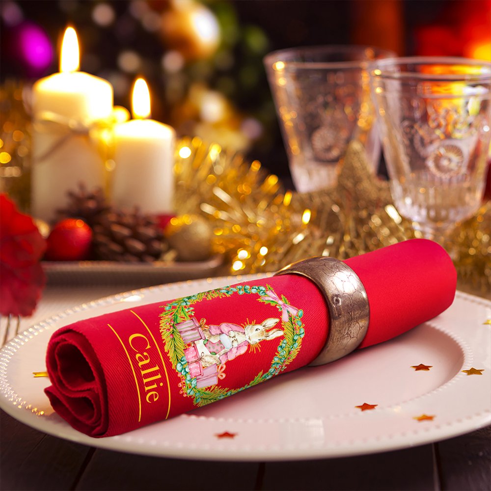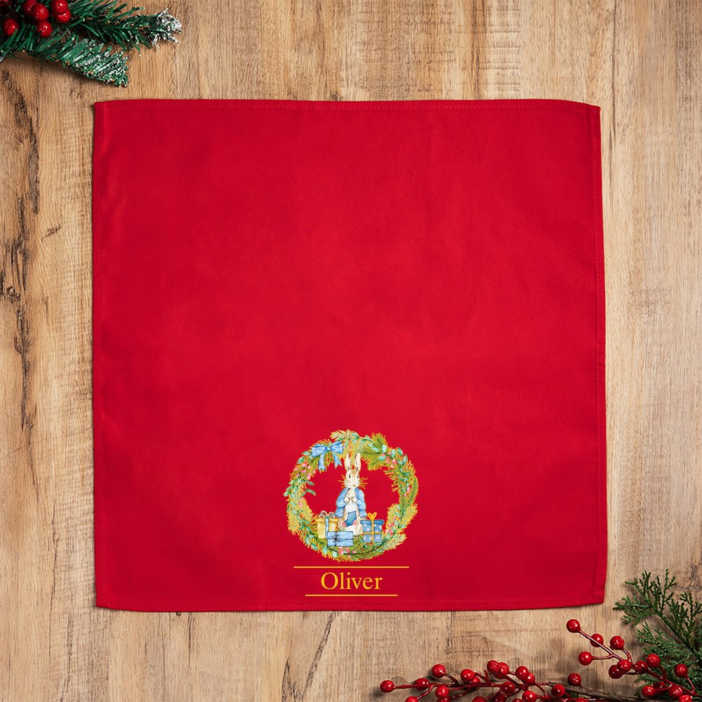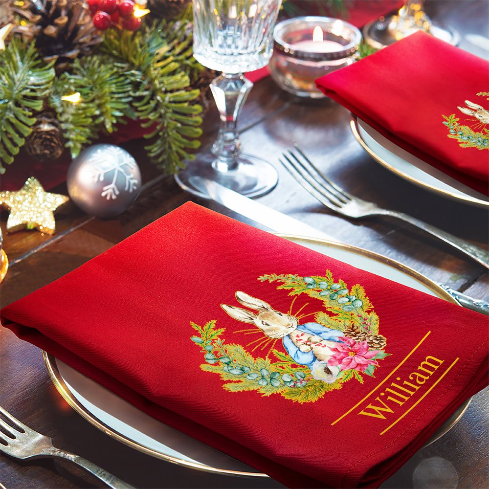Personalised Peter Rabbit Christmas Wreath 100% Cotton Red Reusable Napkin with Name Table Decor Christmas Gift for Family Women Kids
