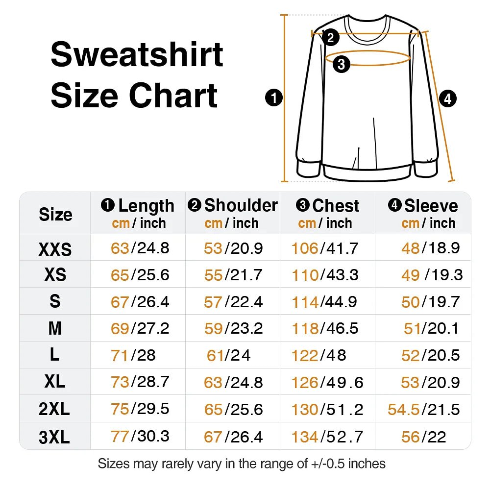 | Measurement: | T-shirt - XXS, XS, S, M, L, XL, 2XL, 3XL Sweatshirt - XXS, XS, S, M, L, XL, 2XL, 3XL |