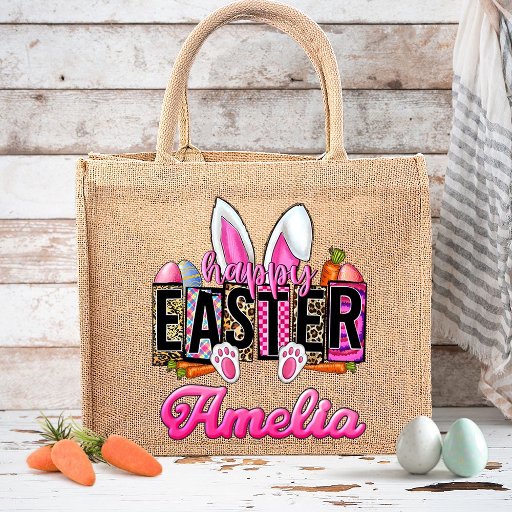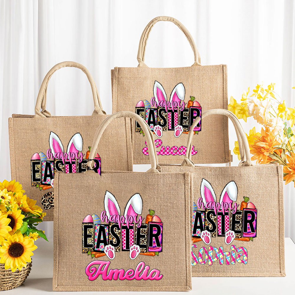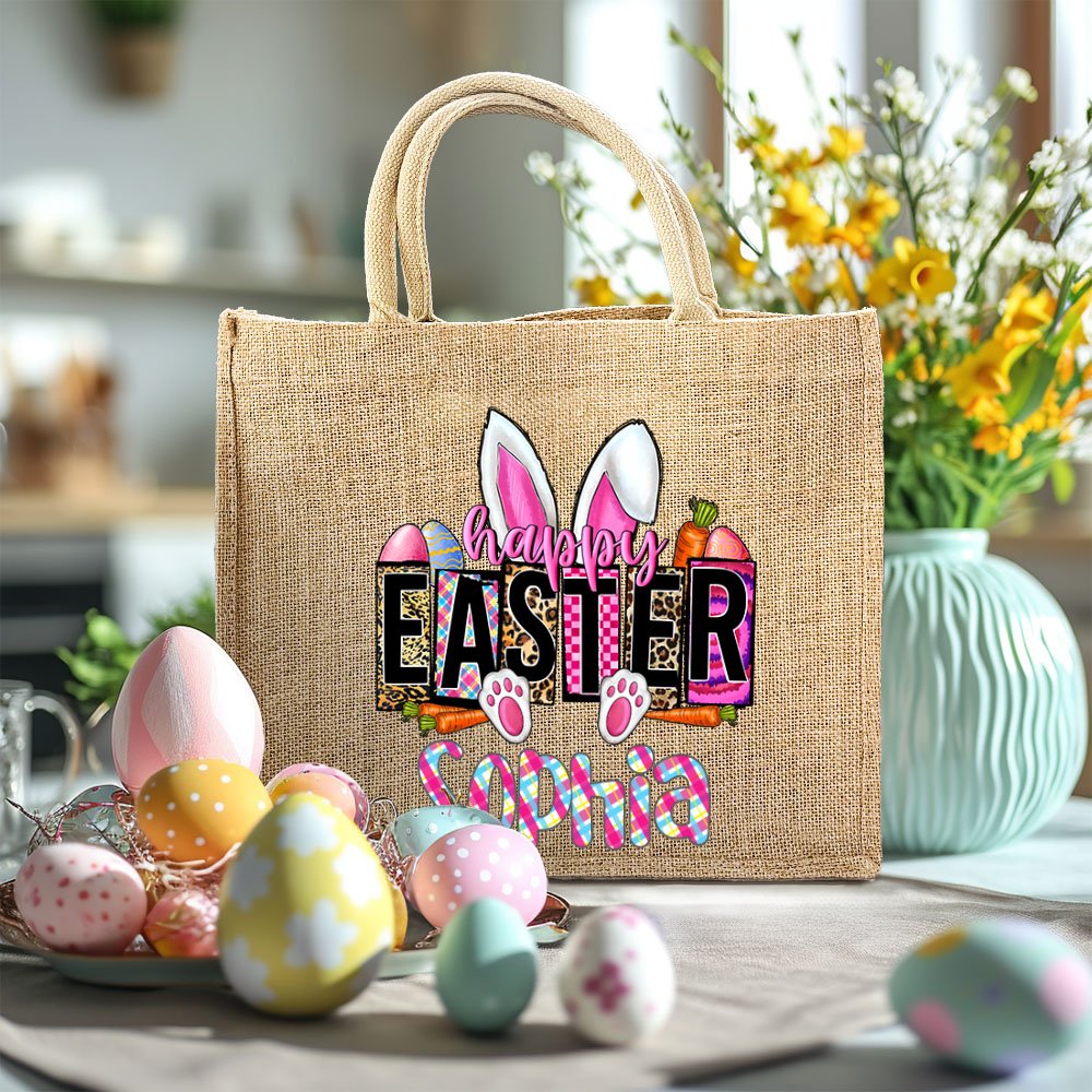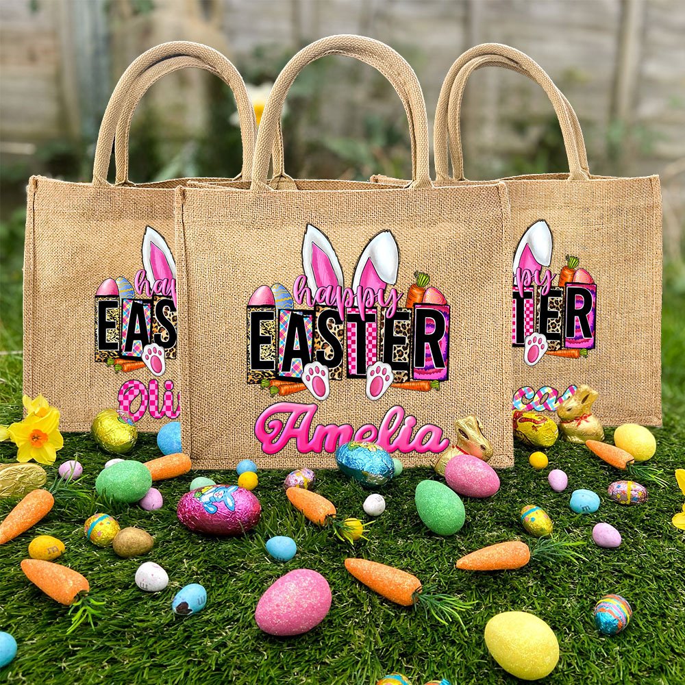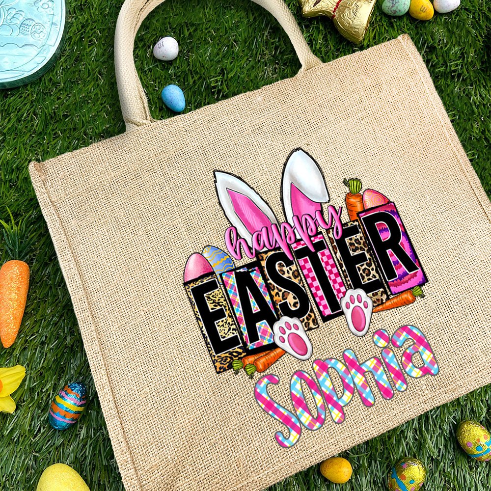 This pink and lively bunny Easter-themed jute tote bag is sure to win kids' hearts. You can choose from 4 styles and 4 fonts to customize your name on it. The styles - pink square plaid, pink gradient, pink and blue striped plaid, and leopard print - will definitely brighten up an Easter celebration or any occasion.