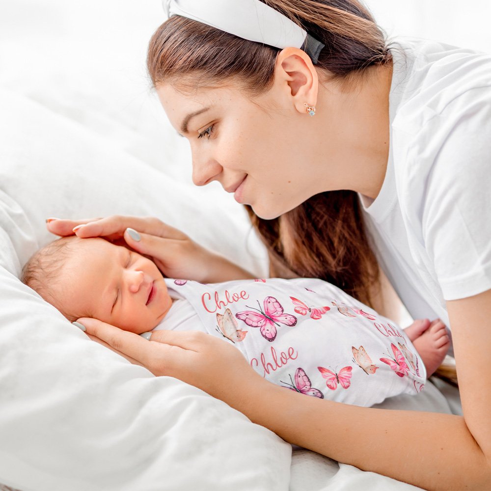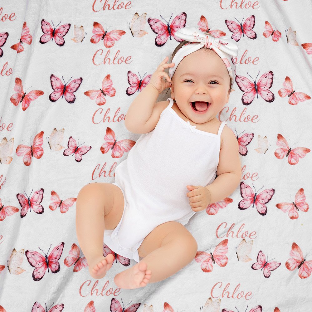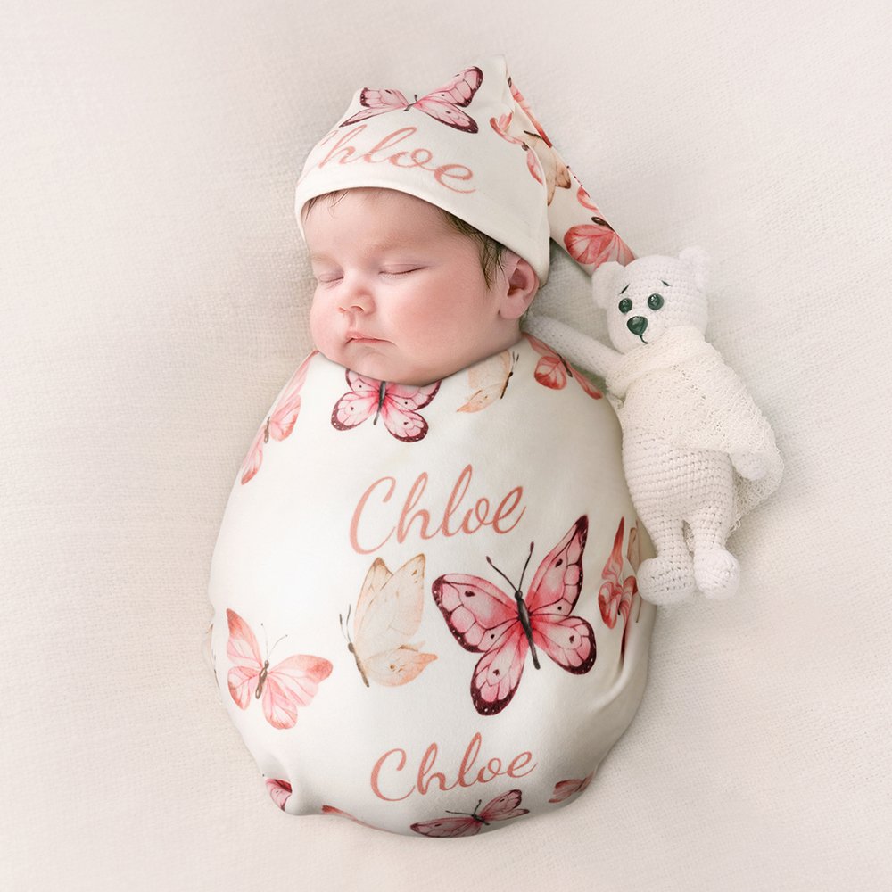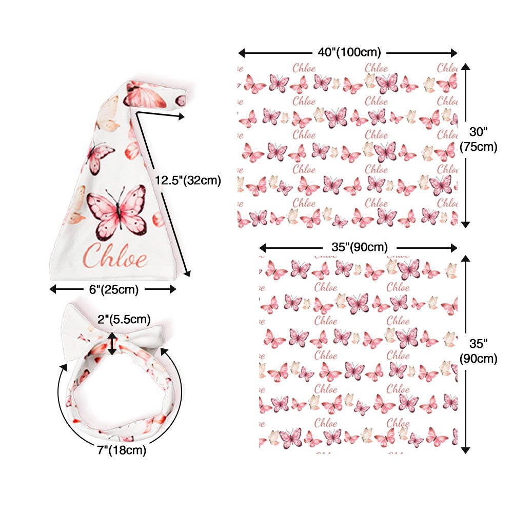 [BUTTERFLY BLISS]: The star of the show is the exquisite butterfly design that graces the blanket, swaddle, hat, and headband. These whimsical, fluttering butterflies are meticulously printed in a stunning pink shade, adding enchantment and femininity to the ensemble. The subtle shimmer and textured details bring the butterflies to life, creating a visually captivating look with everyone oohing and aahing over your baby girl.