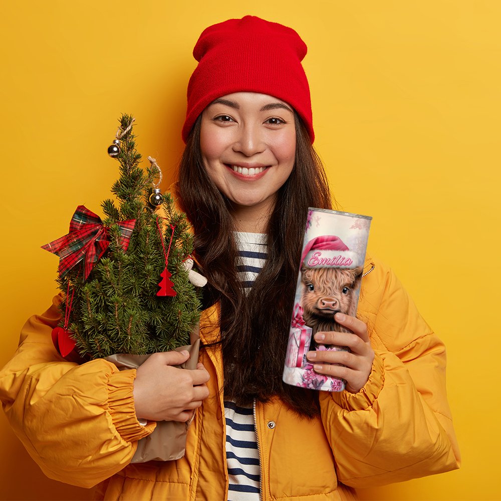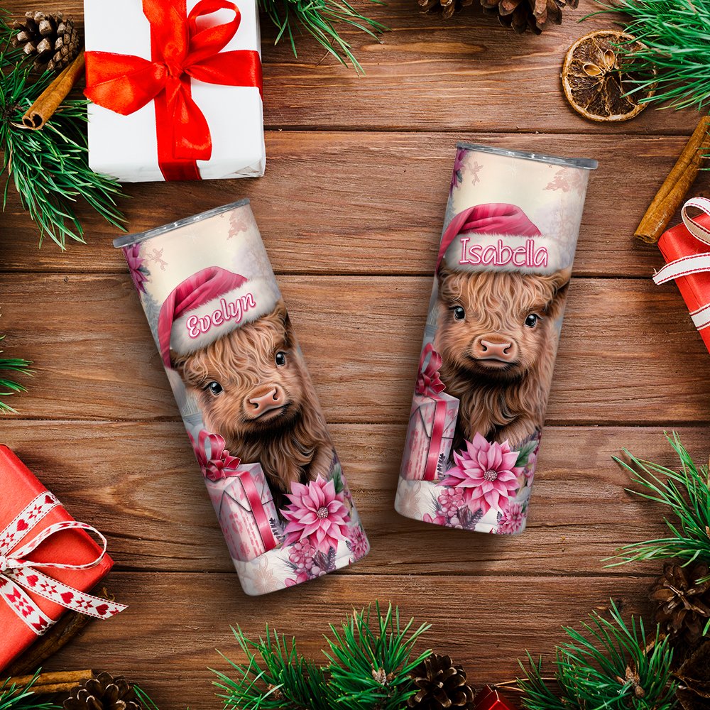 This 20oz tumbler features an adorable highland cow adorned with festive elements and surrounded by a beautiful pink floral motif. The option to customize the cow's hat with a name adds a special touch, making this tumbler unique to its owner.