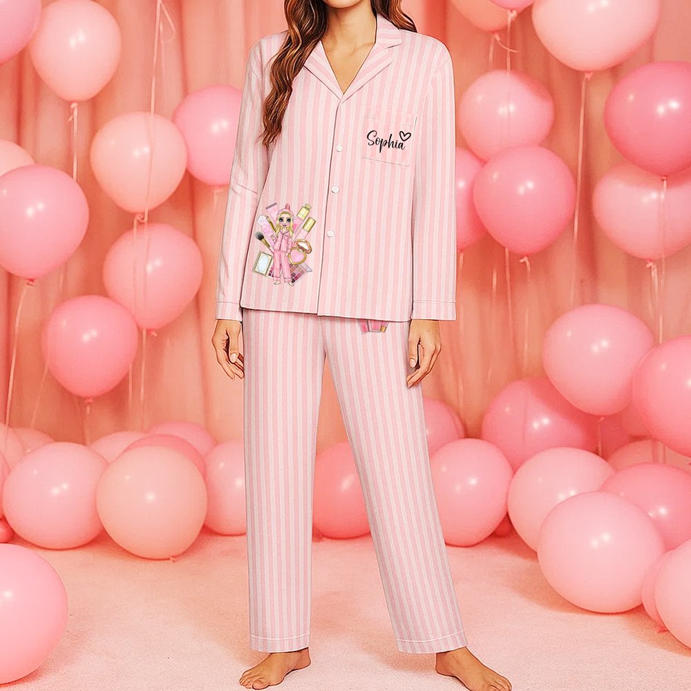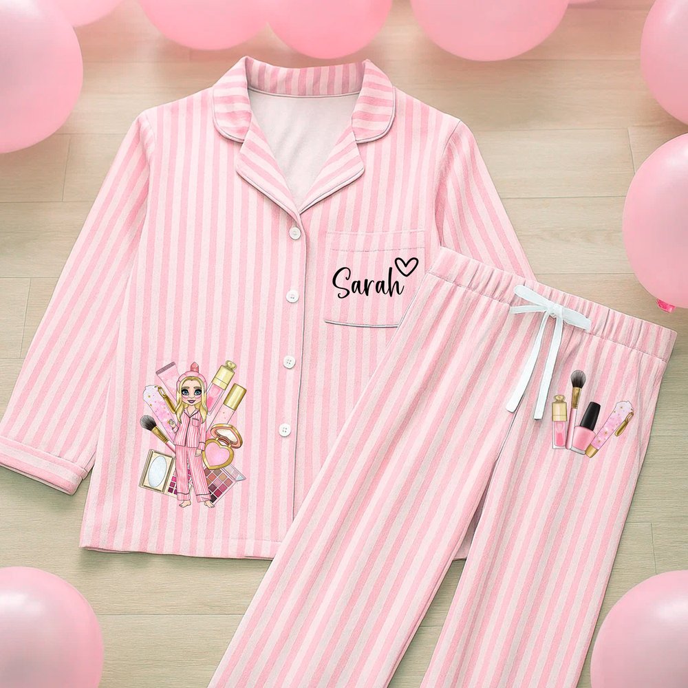 This long-sleeve striped pajama set allows customization. Both the top and pants can feature cosmetic patterns, adding a unique touch. You can also Personalise names, making each set one-of-a-kind.
