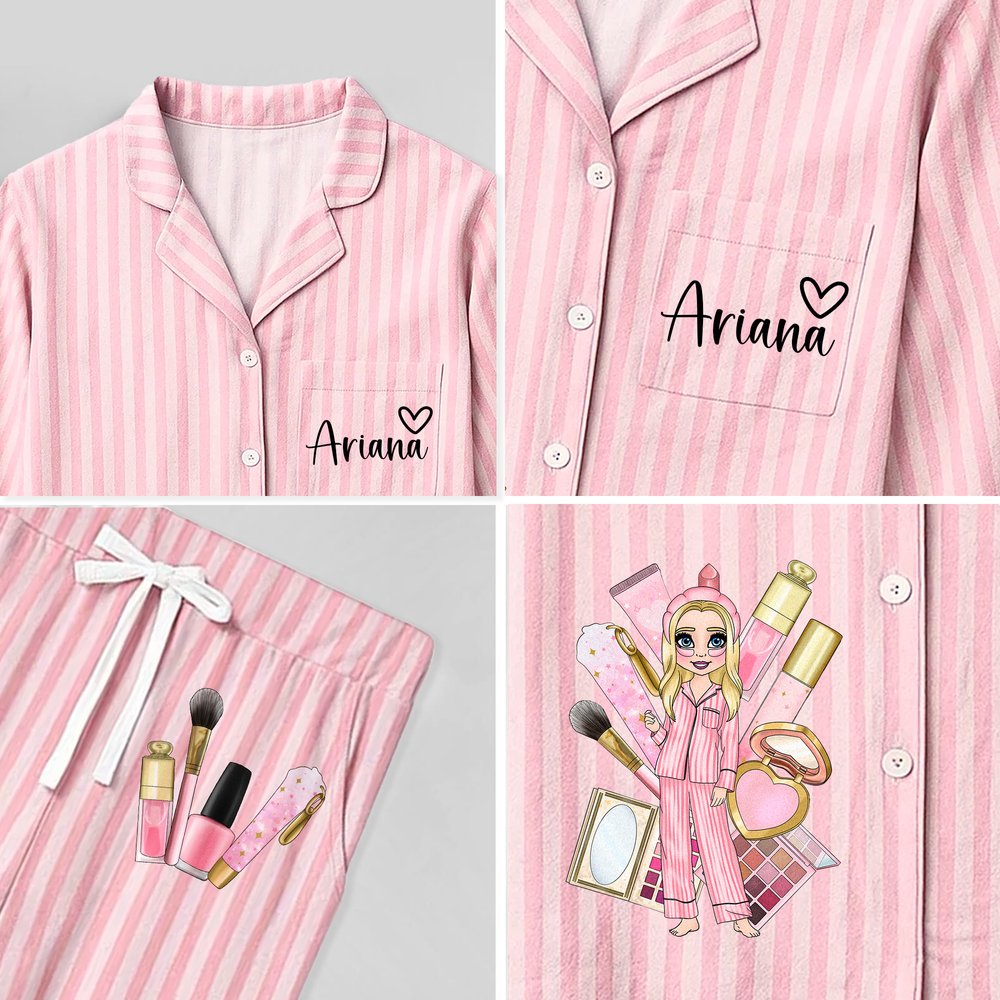 | Feature: | Skin-Friendly, with a Pocket on the Shirt, Pink Striped Design, Makeup Pajamas Girl Design |