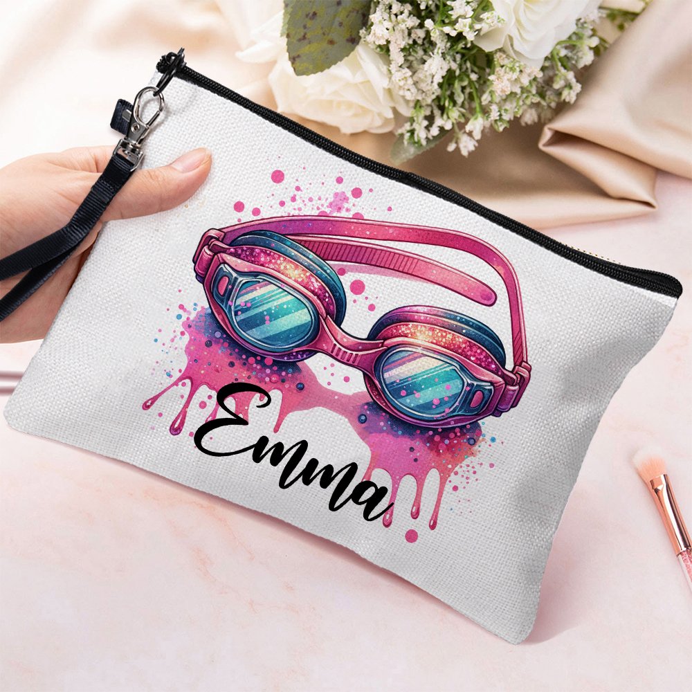 The cosmetic bag features a pink swimming glasses pattern and you can add the recipient's name, adding a personal touch and making it truly one-of-a-kind.