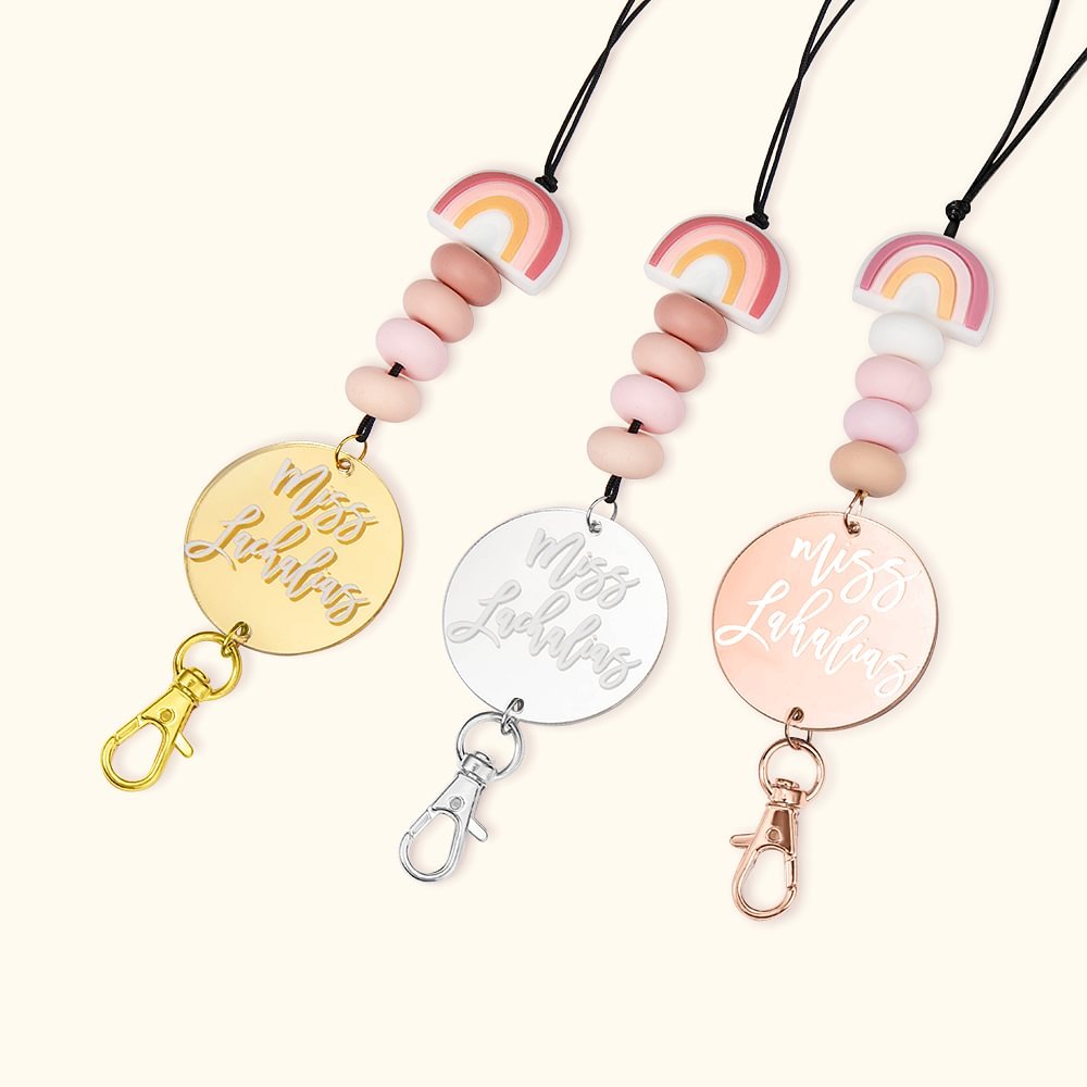 The lanyard uses rainbow and leopard print elements, the lanyard is strong, the beaded color below is bright and sunny, and the mirror acrylic can be customized with an exclusive name to clearly display your name. The bottom hook can hold any certificates, such as teacher certificates, nurse certificates, doctor certificates, and other employee certificates, no longer worry about the loss or placement of the certificates.