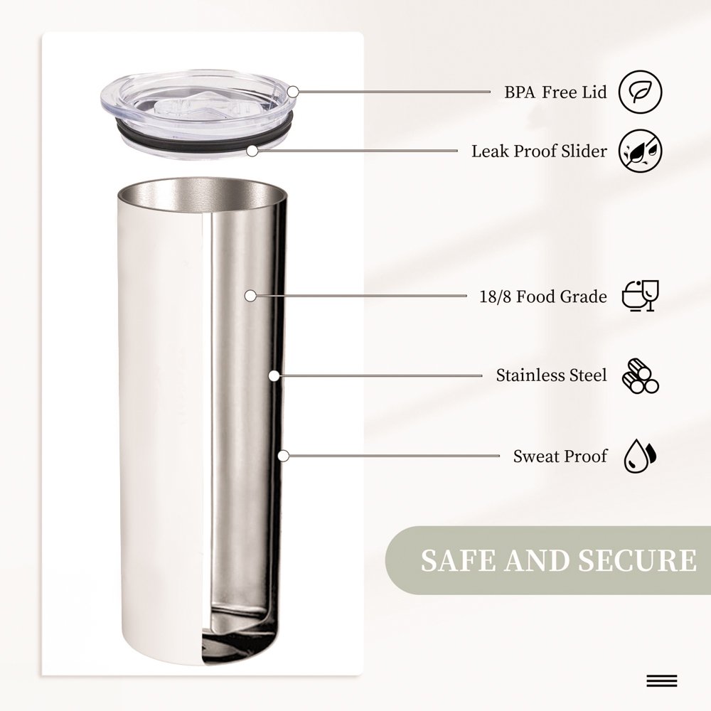 Crafted from high-quality stainless steel, this tumbler guarantees durability and longevity. Whether you're heading to work, going on a road trip, or simply enjoying a picnic in the park, this tumbler is your perfect companion. Its double-wall vacuum insulation ensures your favorite beverages stay at the perfect temperature for hours. And the spill-proof design and secure lid ensure that you can take it anywhere without any leaks or spills. Plus, its 20oz capacity means you'll have plenty of your favorite drink to keep you hydrated throughout the day.