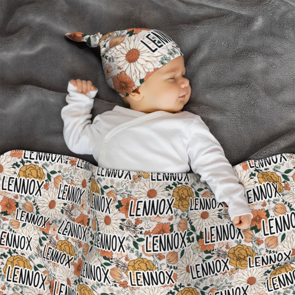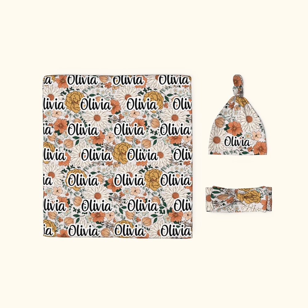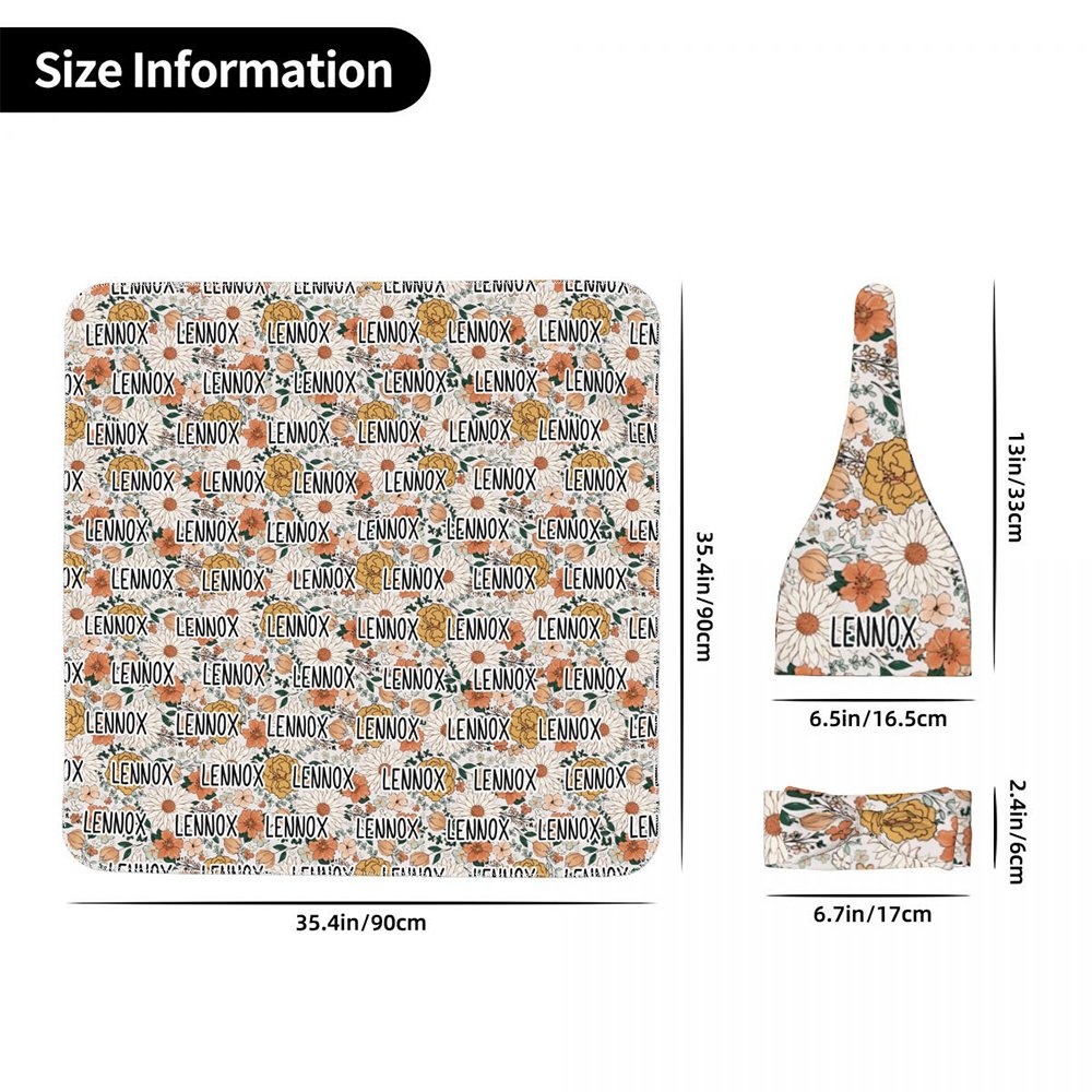 Not sure what to gift baby from 0–6 months? This vintage floral swaddle 3-piece set will surely meet your requirements. You can customize the baby's name on the blanket and hat with a variety of fonts to choose from. This unique 3-piece gift set, including a hat, a blanket, and a hair band, is sure to be a very meaningful gift for the baby shower.
