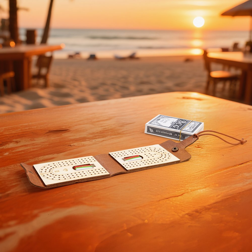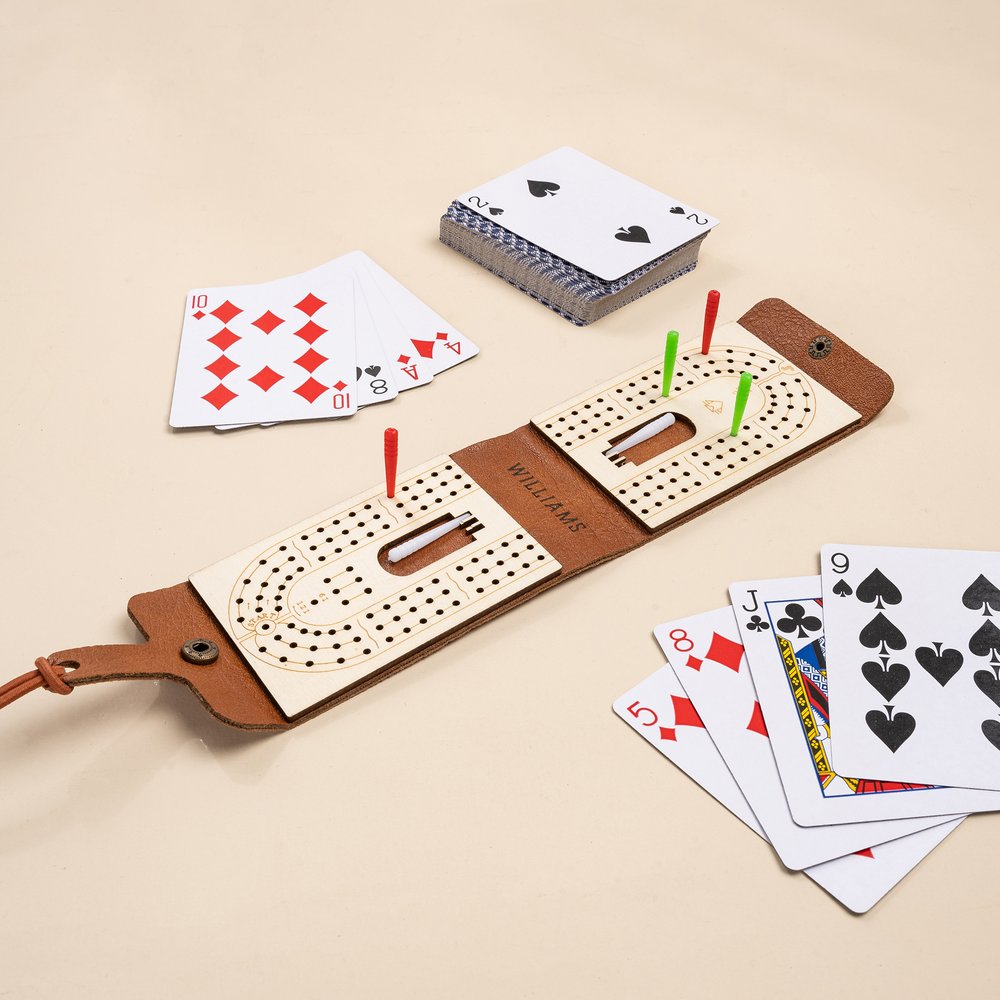 Centered around a standard 121-point, 3-track Cribbage Board, this piece allows for custom logos or text. Its foldable design strikes a balance between minimalist aesthetics and practical portability. The 121-point, 3-rail layout adheres to standard game rules without compromising gameplay. When folded, it easily accommodates a standard or poker-sized deck of cards, eliminating the need for a separate card storage pouch.