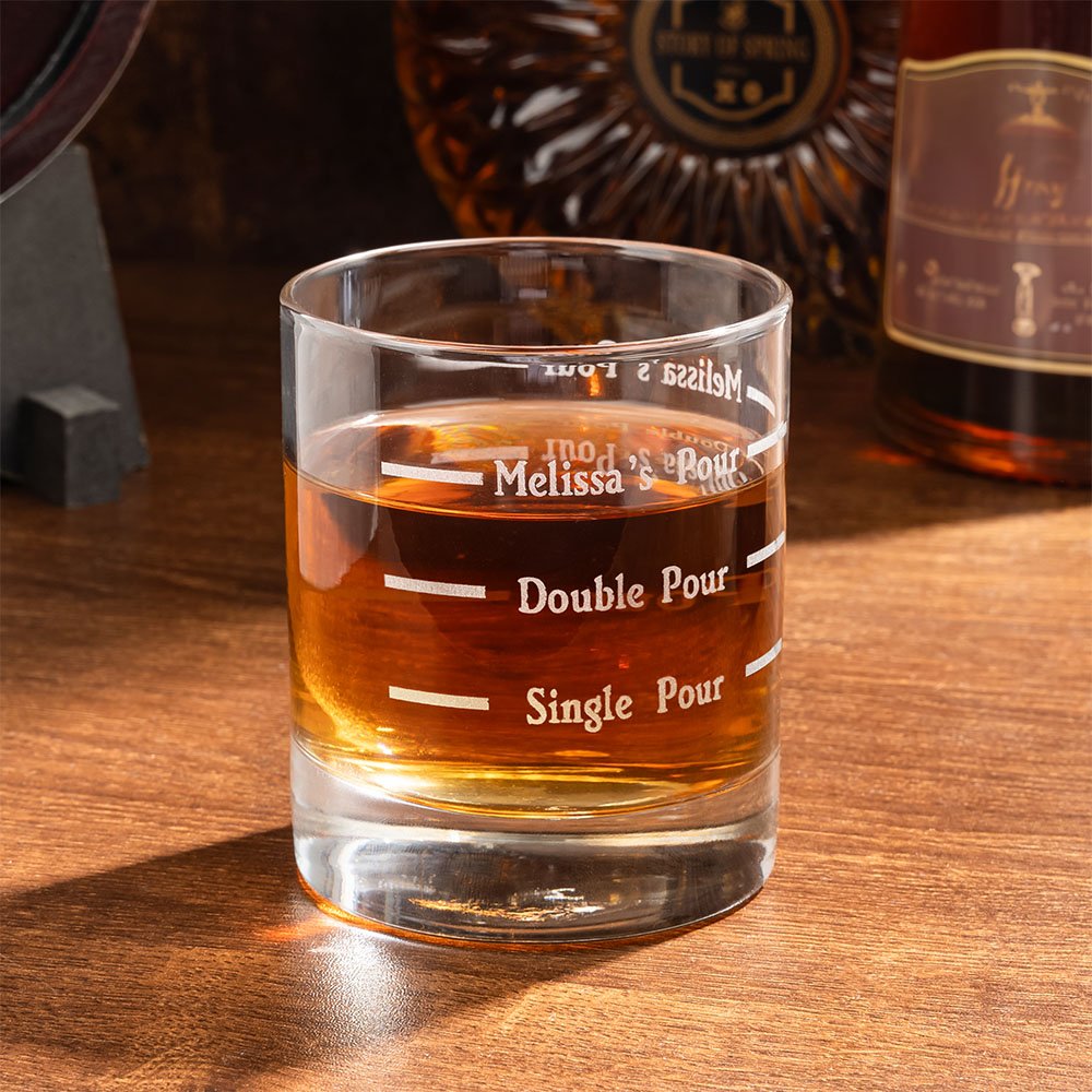 "Single Pour, Double Pour, Your Pour", Featuring a witty design, a unique wine glass for whiskey lovers. It has pour lines and supports customized names. It is an ideal gift for friends and family around you.