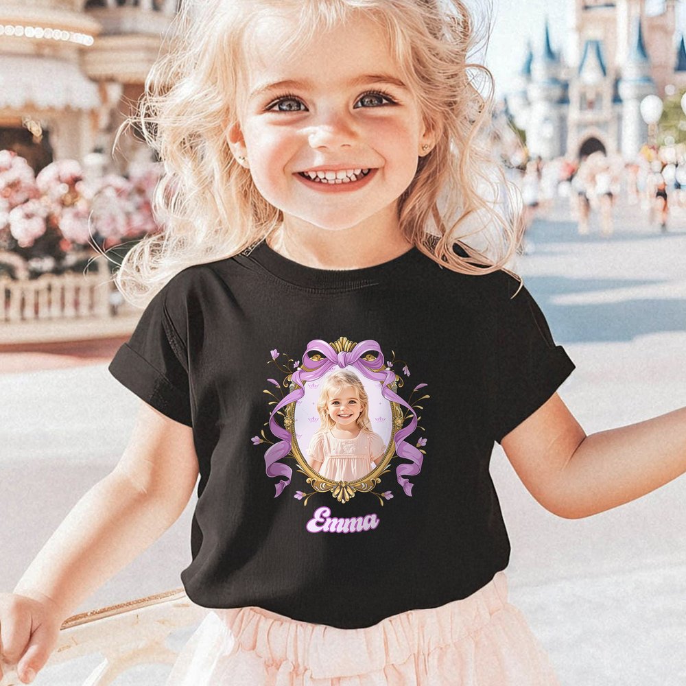Elevate the magic by personalizing the t-shirt with your photos and a name! Whether it's a cherished memory, a beloved character, or a meaningful portrait, integrating a photo into the princess frame design adds a one-of-a-kind touch. Paired with a custom name and bowknots, this customization transforms the t-shirt into a unique keepsake.