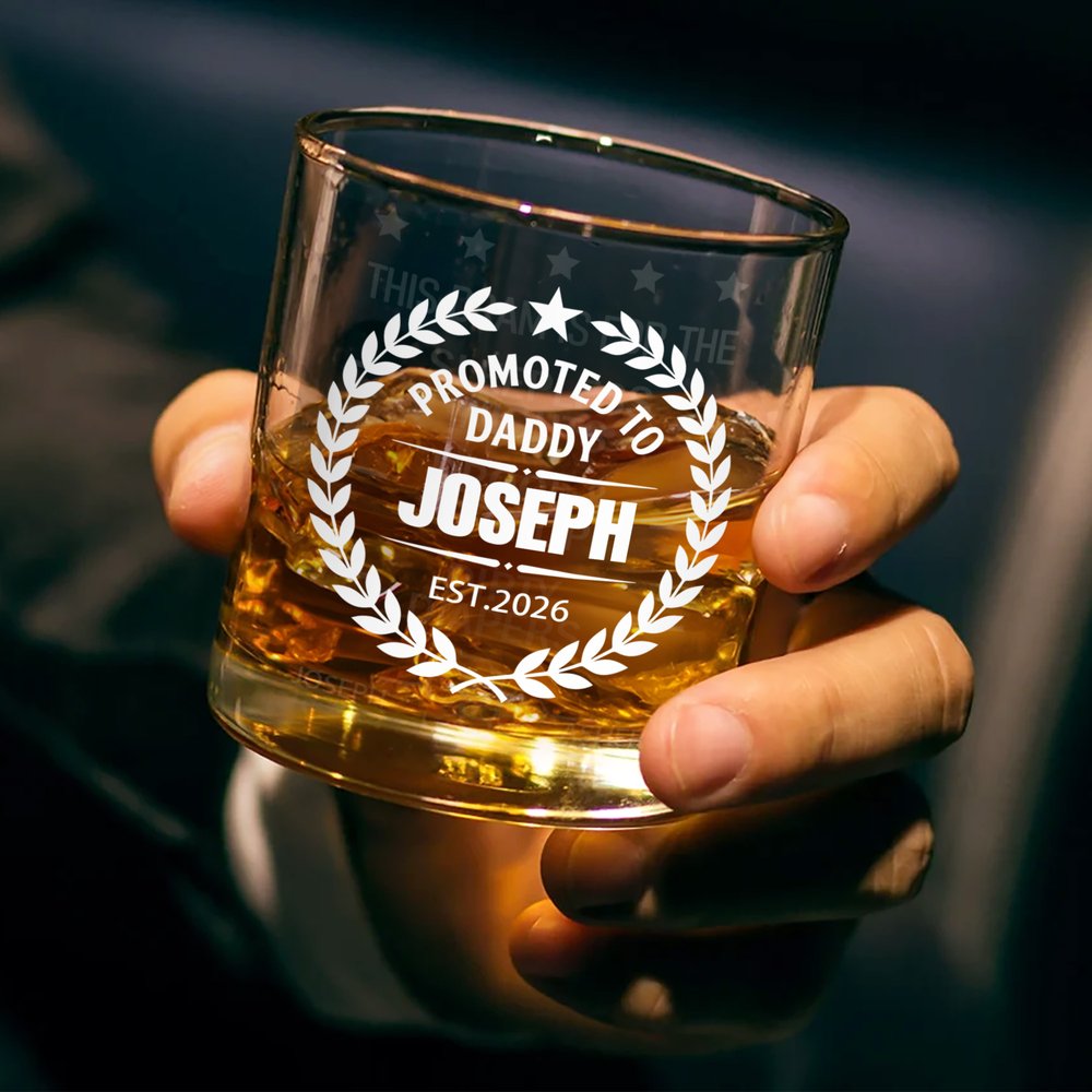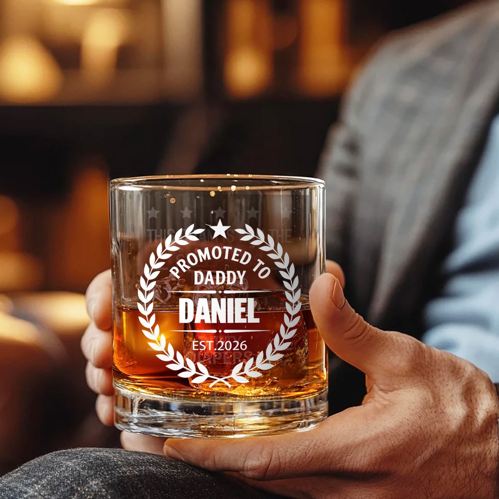 Centered around the theme “Promoted to Daddy,” this whisky glass features a laurel wreath on the front with a custom name and year, celebrating the proud milestone of becoming a father. On the back, five stars, playful parenting quotes, and a fist-bump motif capture the relatable chaos of new parenthood. The result is a keepsake that balances formal pride with personal family warmth, turning every glass into a one-of-a-kind tribute to his journey as a dad.