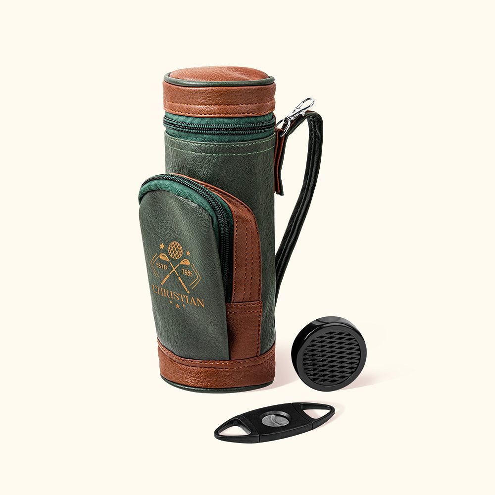 The main compartment of this golf bag can hold up to 8 cigars or 10 golf balls. It also features a built-in wooden insert to hold the recipient's favorite beverage. The small pocket is perfect for storing accessories like lighters, divot tools, and knives. With a lock buckle and a comfortable handle, it is convenient to carry on the golf course.